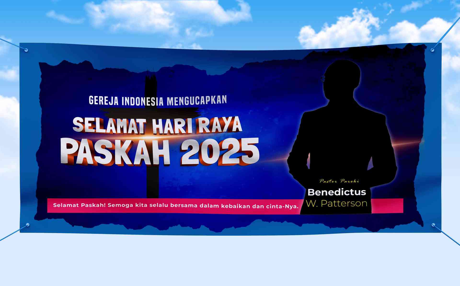 Desain baliho ini dibuat untuk menyambut perayaan Hari Raya Paskah 2025 oleh Gereja Indonesia. Desainnya menggunakan latar belakang berwarna biru tua...