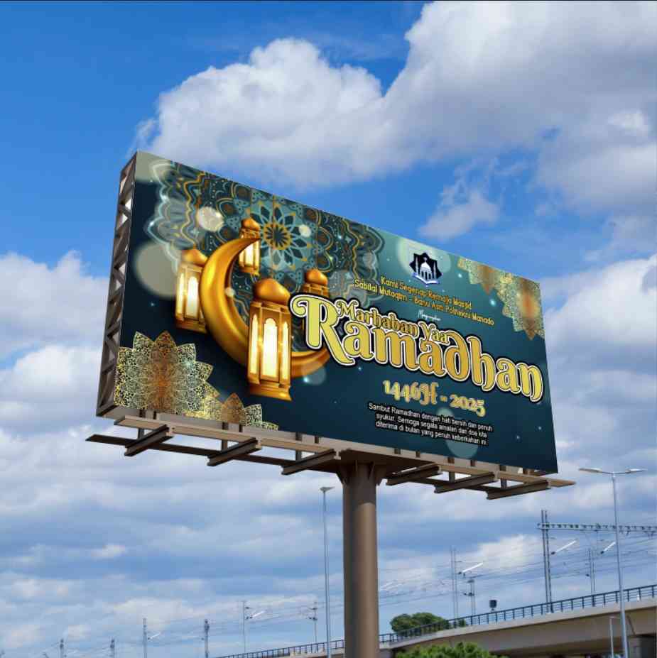 Baliho ini memiliki desain elegan dengan latar belakang biru gelap yang dipadukan dengan motif Islami bercorak emas. Di bagian kiri, terdapat bulan sa...