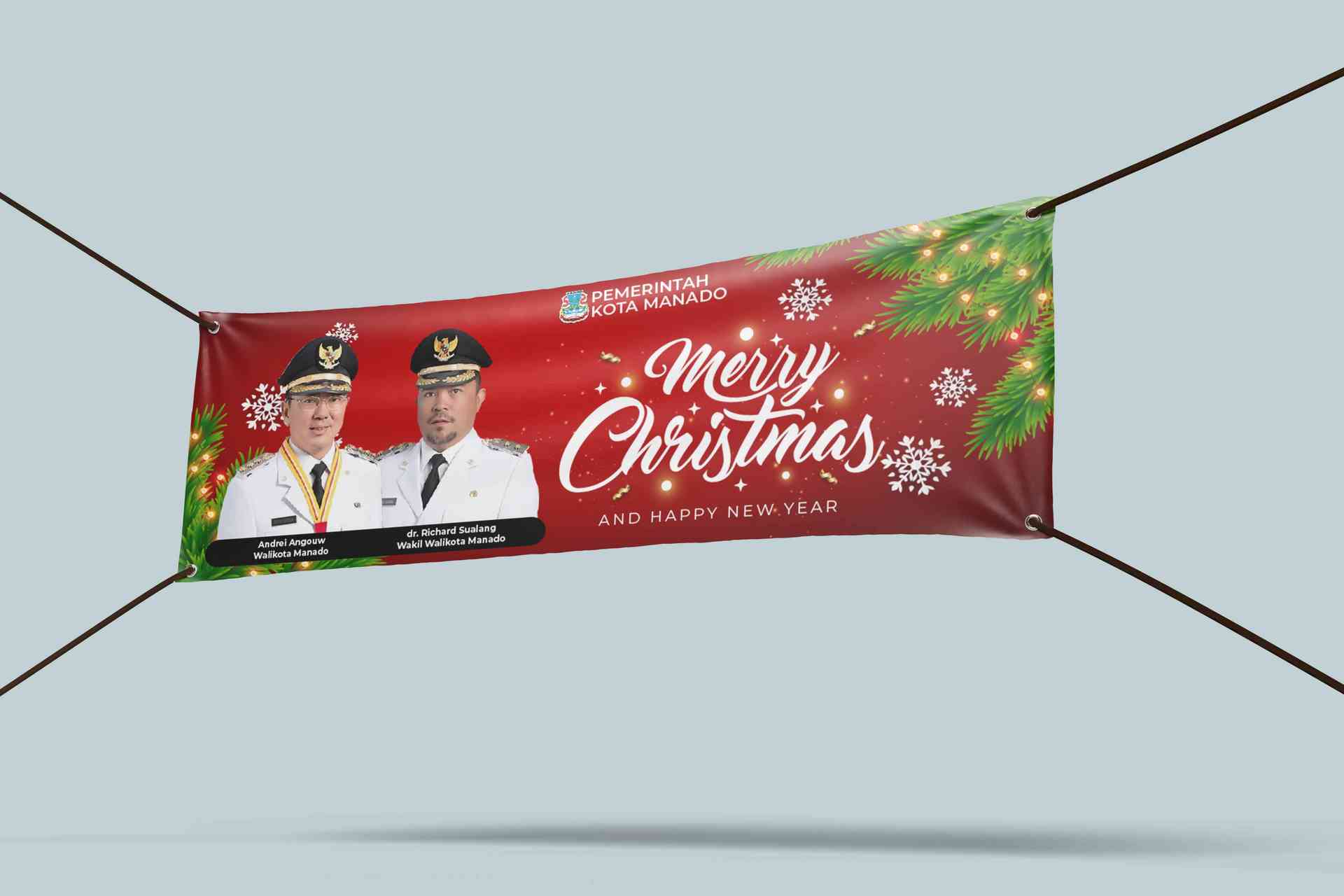 Desain baliho ini menggabungkan nuansa hangat dan penuh sukacita dari Natal dengan semangat penuh warna dan keceriaan Tahun Baru. Kombinasi elemen Natal dan Taun Baru menciptakan suasana meriah yang menyambut musim liburan dengan penuh kegembiraan.