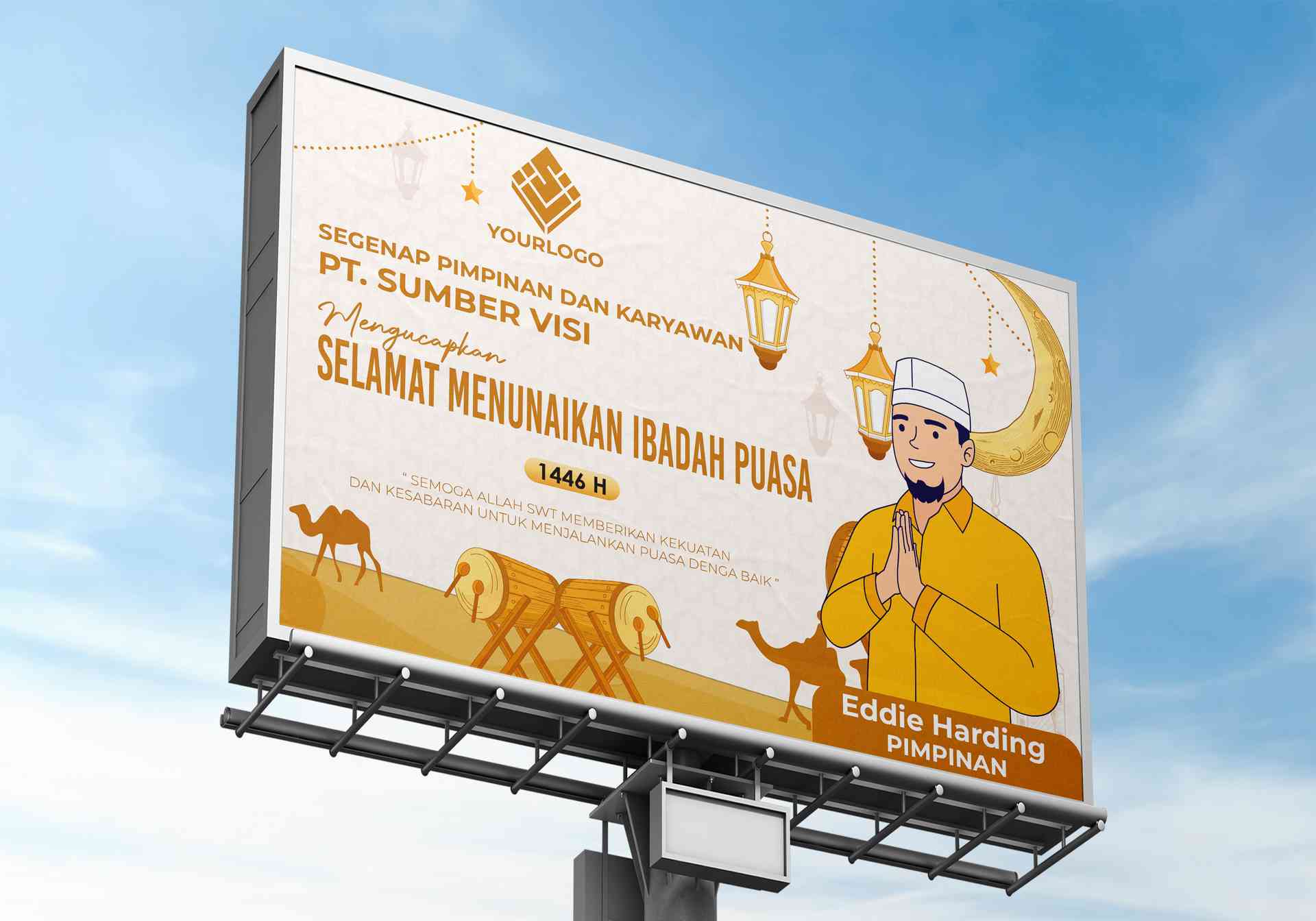 Gambar ini menampilkan sebuah papan reklame (billboard) dengan ucapan Selamat Menunaikan Ibadah Puasa 1446 H. Desain billboard memiliki nuansa yang el...