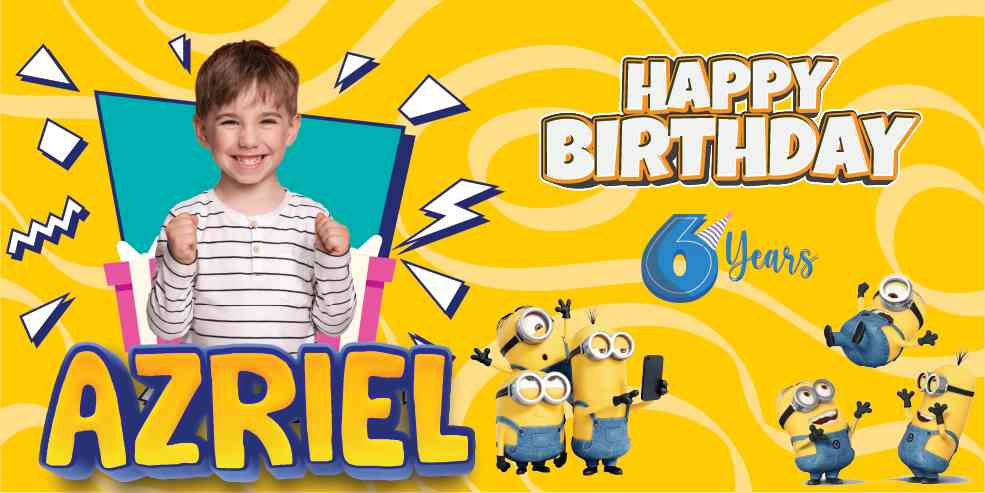 "Baliho berukuran besar yang memukau dengan latar belakang cerah dan penuh warna, menampilkan Minions, karakter lucu dari film animasi yang terkenal. Di tengah-tengahnya, terdapat gambar besar dari Minions yang tersenyum lebar, sambil memegang balon dan kue ulang tahun yang berwarna-warni. Di sekitarnya, terhampar dekorasi yang menggemaskan seperti bunga-bunga besar dan confetti yang melayang-layang. Tulisan 'Selamat Ulang Tahun!' yang ceria menghiasi bagian atas baliho, dengan angka usia yang bisa disesuaikan dengan acara ulang tahun yang sedang dirayakan. Keseluruhan desain memberikan kesan riang dan menyenangkan, sempurna untuk merayakan momen berharga bersama teman dan keluarga."