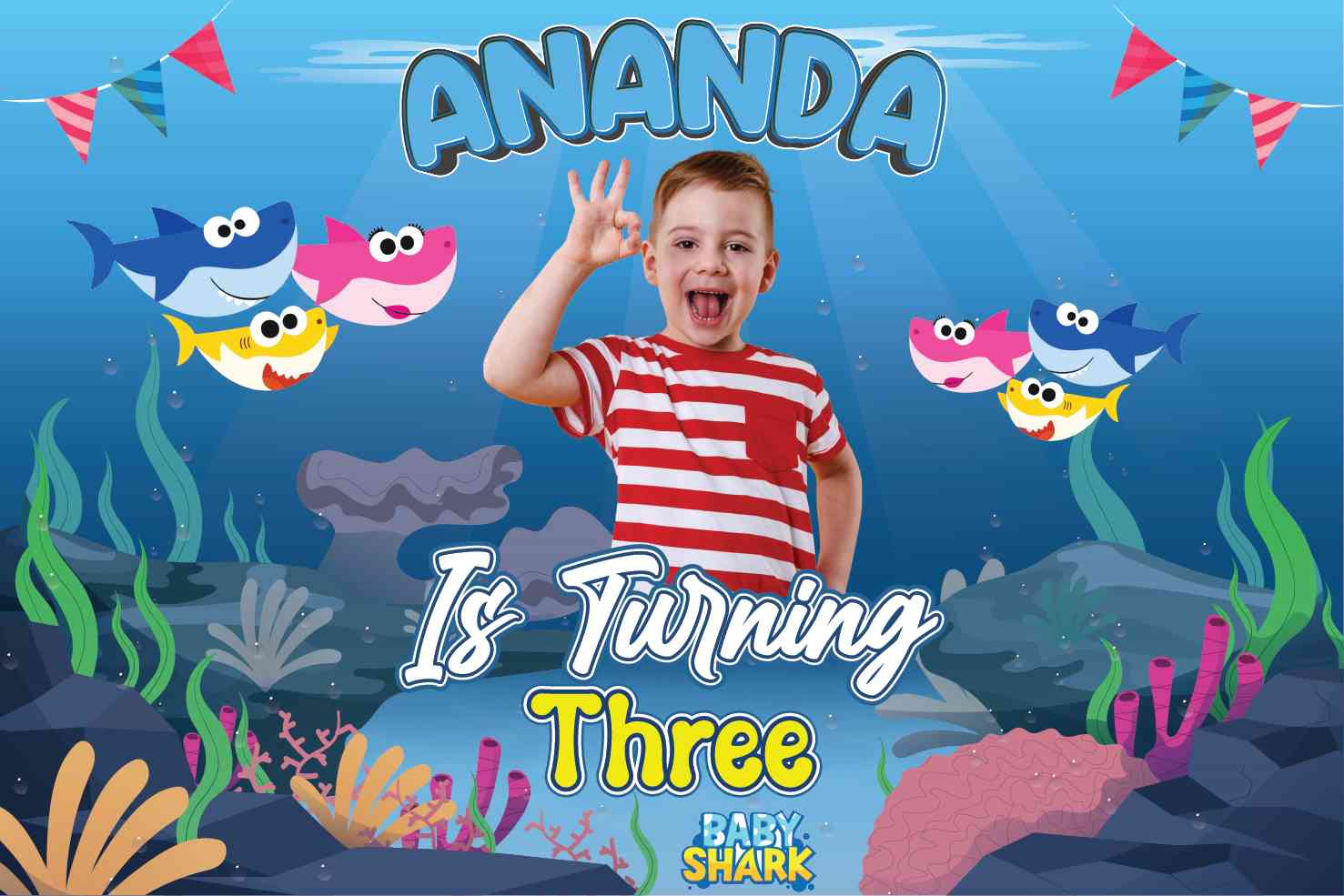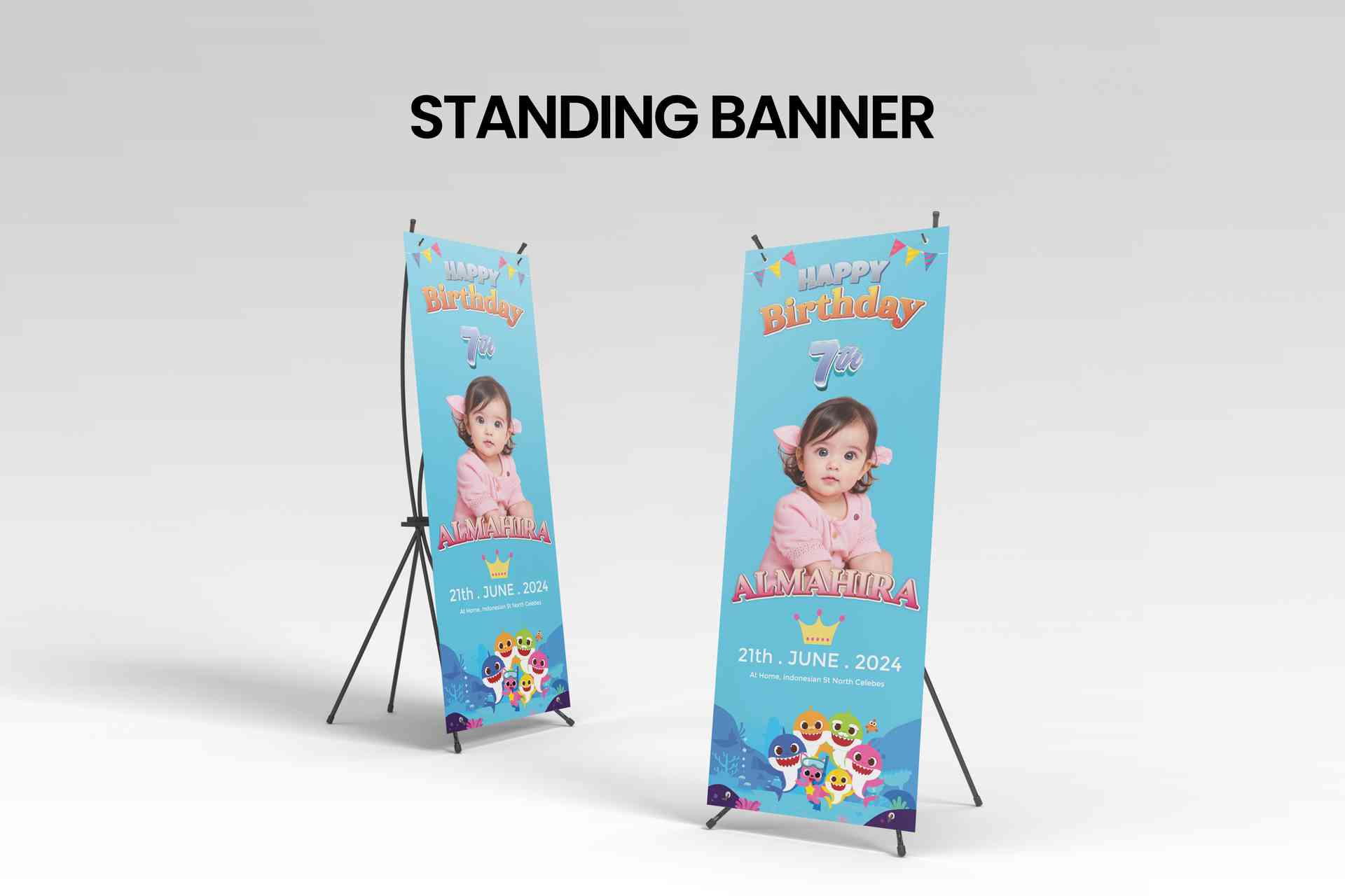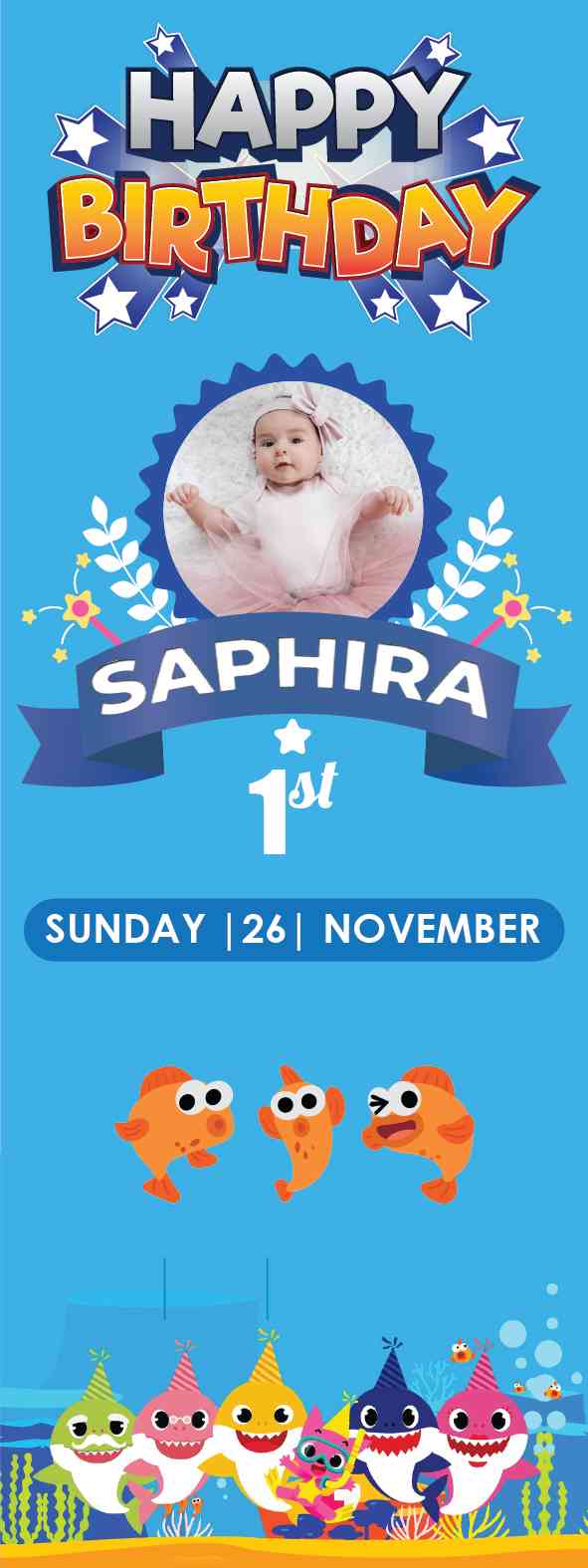 "Selamat datang di pesta ulang tahun yang dipenuhi dengan keceriaan dari dasar laut! Baliho kami menghadirkan dunia Baby Shark yang menggemaskan langs...