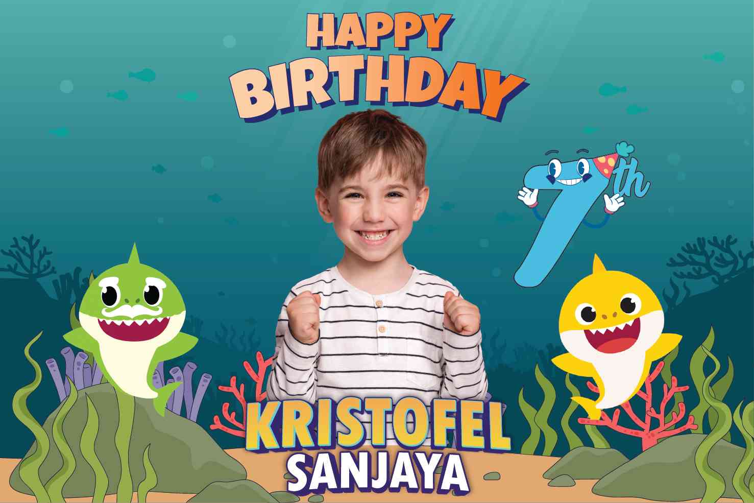 "Selamat datang di perayaan ulang tahun yang penuh dengan pesona bawah laut ala Baby Shark! Baliho kami menampilkan karakter-karakter yang paling disu...