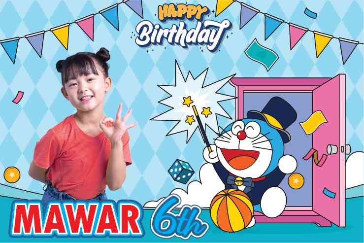 "Tampilan baliho ulang tahun dengan tema Doraemon adalah kombinasi sempurna antara kesenangan dan keajaiban. Di tengah-tengah latar belakang yang cera...