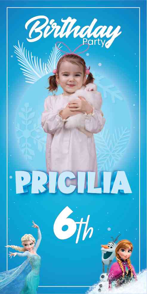 Tanggal dan waktu acara yang tercantum di bawah bayangan pemandangan salju, menjanjikan hari yang penuh kebahagiaan dan kegembiraan. Warna putih dan biru yang memukau serta elemen-elemen dekorasi yang terinspirasi dari dunia Frozen memastikan bahwa setiap momen terasa seperti bagian dari dongeng yang nyata.