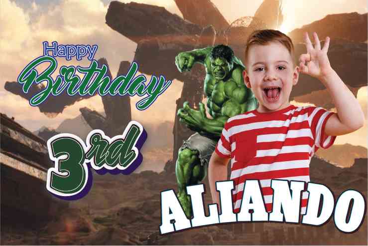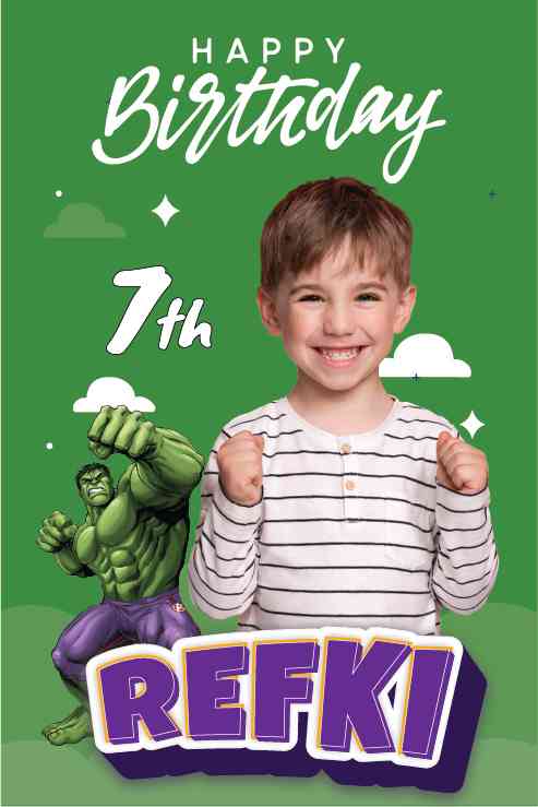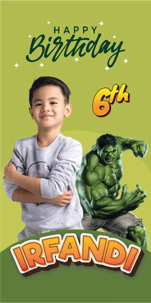 Bergabunglah dalam perayaan ulang tahun yang luar biasa ini dengan tema yang penuh kekuatan: Hulk! Di tengah-tengah kota yang gemerlap, baliho ini men...