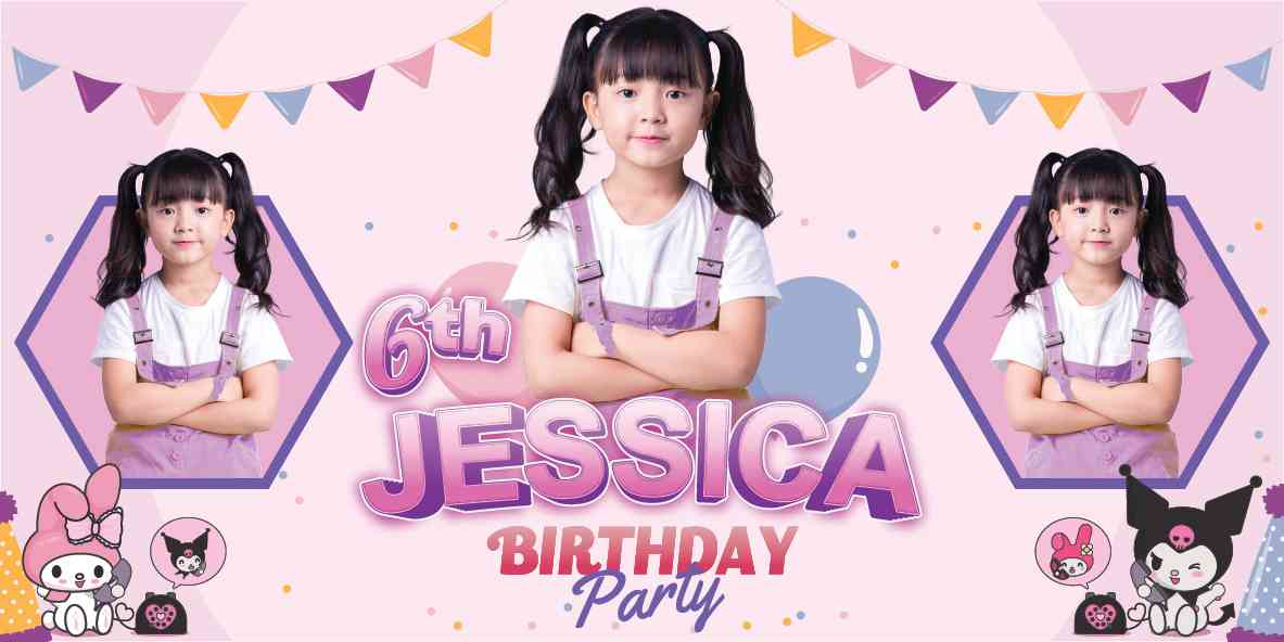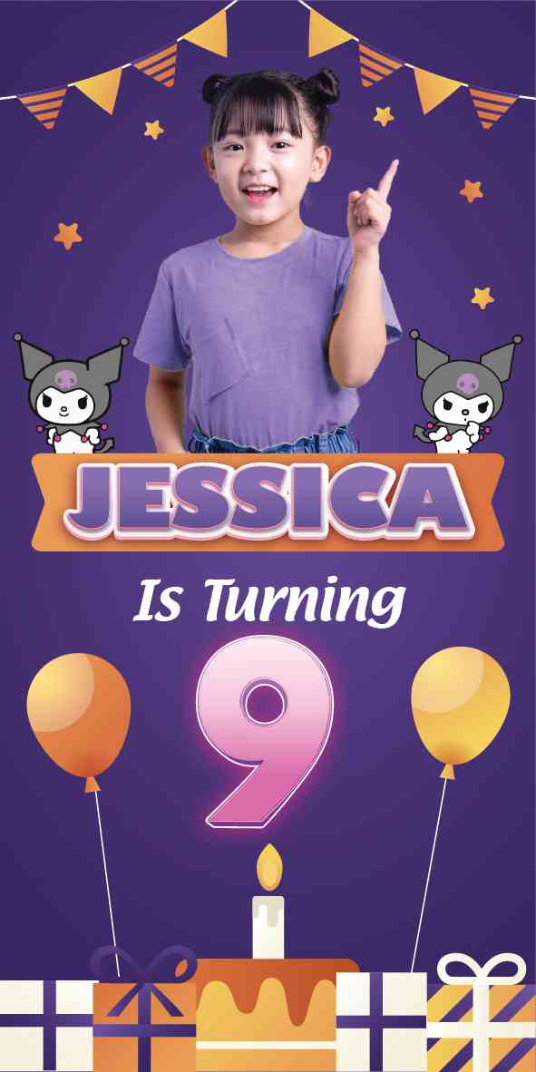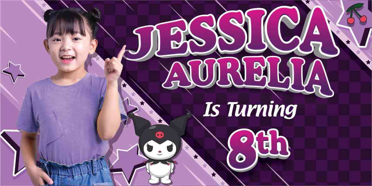 Mari rayakan ulang tahun yang penuh keceriaan dengan tema Kuromi yang penuh gaya ini! Baliho ini menampilkan Kuromi, karakter imut dengan gaya gothic yang khas, dalam serangkaian aksi lucu dan menggemaskan. Latar belakangnya dihiasi dengan palet warna ungu gelap dan hitam yang mencolok, dengan sentuhan bintang-bintang dan bulan untuk menambahkan nuansa magis.
