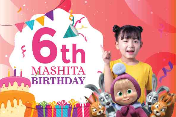 Di sekitar baliho, taman ajaib yang dipenuhi dengan bunga-bunga berwarna-warni dan rumput hijau mengundang para tamu kecil untuk menjelajahi dunia yang penuh keajaiban ini. Patung-patung besar Masha and the Bear bersama karakter-karakter lainnya menambahkan sentuhan magis pada suasana pesta, membuat semua orang merasa seperti berada di dalam cerita dongeng yang hidup.