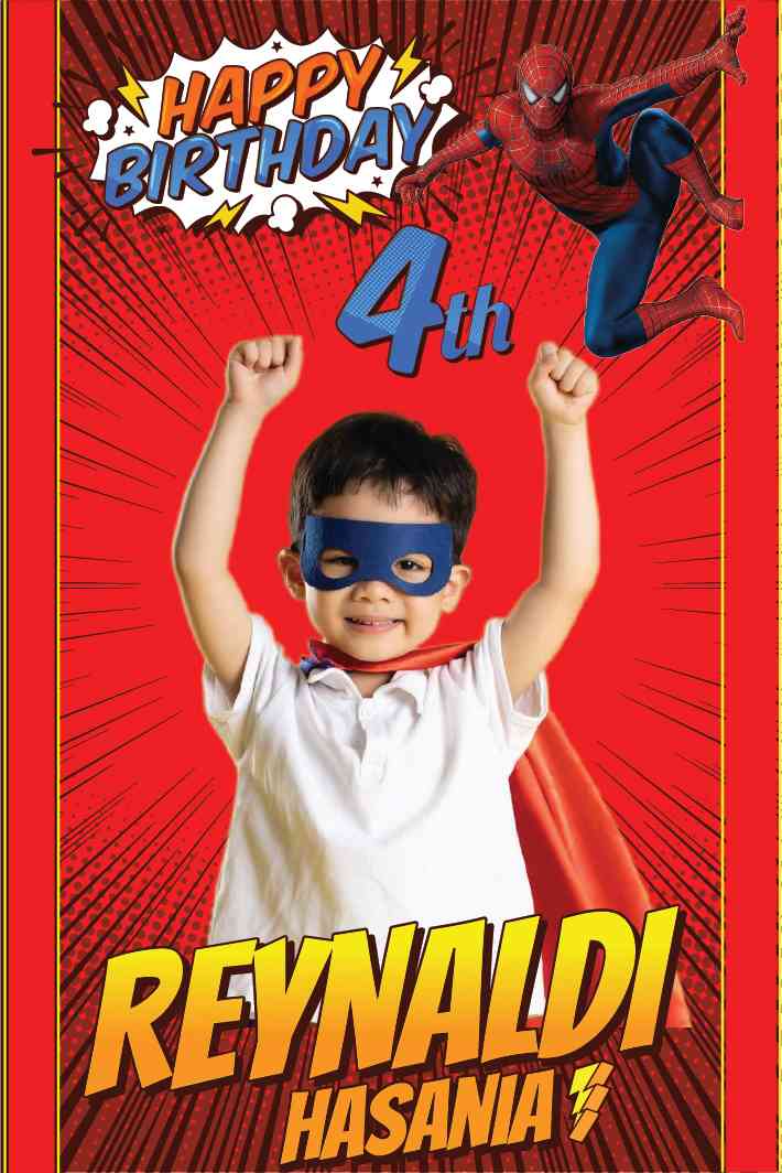 Baliho ulang tahun bertema Spiderman adalah pemandangan yang pasti membuat anak-anak bersemangat dan menghadirkan atmosfer penuh petualangan super her...