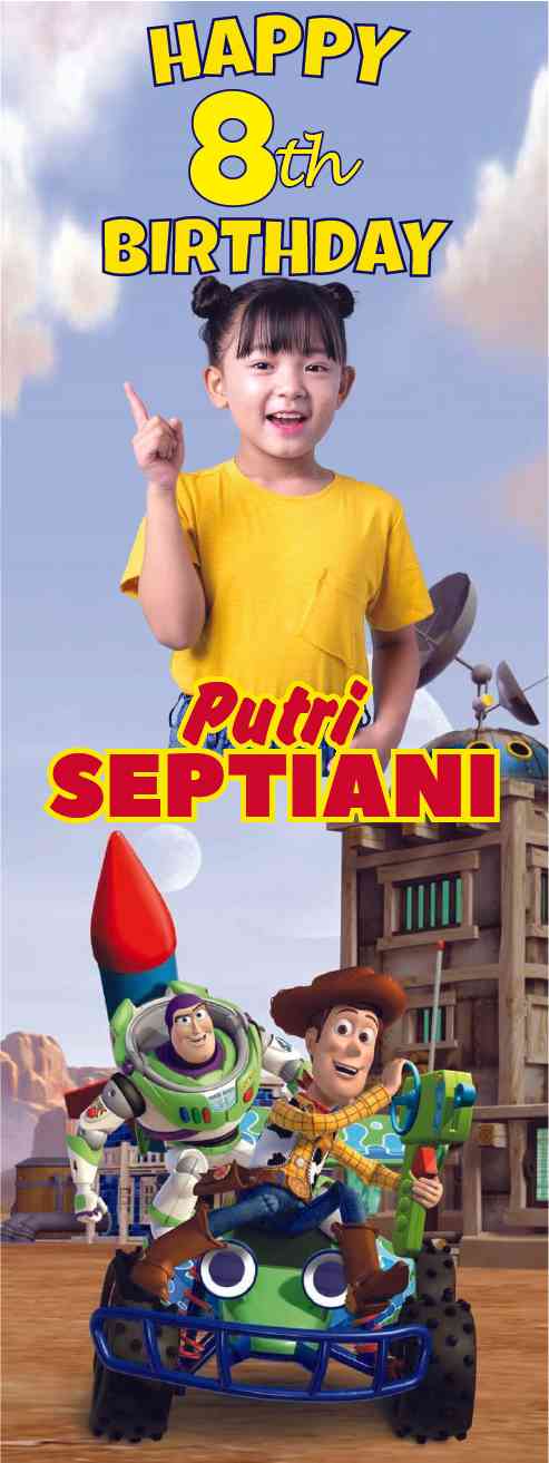 Banner ulang tahun bertema Toy Story adalah jalan pintas menuju petualangan di dunia mainan yang penuh keajaiban. Di tengah banner, karakter-karakter legendaris seperti Woody, sang Sheriff yang berjiwa besar, dan Buzz Lightyear, astronot pemberani dari luar angkasa, menyambut semua tamu dengan senyum hangat mereka yang tak terlupakan.