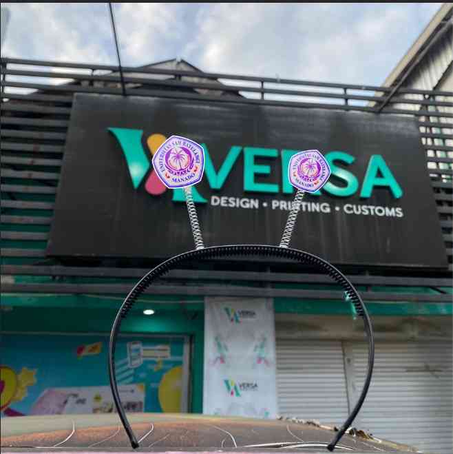 Desain bando tuing-tuing ini menampilkan logo Gereja Masehi Injili di Minahasa (GMIM) dengan gambar burung manguni khas Sulawesi Utara berwarna coklat, lengkap dengan lingkaran bertuliskan nama gereja di sekelilingnya, dipadukan dengan tulisan “PEMUDA GMIM” berwarna kuning dengan outline merah tebal di bawah logo, menegaskan identitas organisasi pemuda gereja. Kedua ornamen ini terpasang di atas pegas perak yang lentur, memberikan efek tuing-tuing saat bergerak sehingga menampilkan kesan playful dan penuh semangat. Bagian bandonya menggunakan bahan plastik hitam dengan desain melengkung ergonomis, nyaman dipakai untuk berbagai aktivitas. Cocok digunakan saat kegiatan ibadah pemuda, KKR, retreat, lomba seni rohani, photobooth acara gereja, maupun sebagai merchandise untuk menumbuhkan rasa bangga, solidaritas, dan identitas rohani yang kuat secara fun dan memorable.