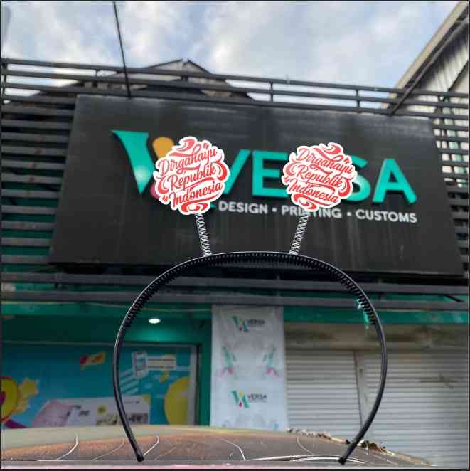 Bando Tuing-Tuing adalah aksesori kepala berbentuk melingkar dengan dua ornamen bulat di atas pegas yang menonjol, menampilkan desain warna dominan merah dan putih serta motif angka “77th” beserta tulisan “Indonesia Merdeka”. Ornamen ini mencolok dengan tema nasionalis dan ilustrasi khas perayaan HUT Kemerdekaan RI, cocok digunakan dalam acara perayaan, pawai, atau lomba agustusan, menyasar target pasar anak-anak hingga dewasa yang ingin tampil meriah dalam peringatan hari nasional.