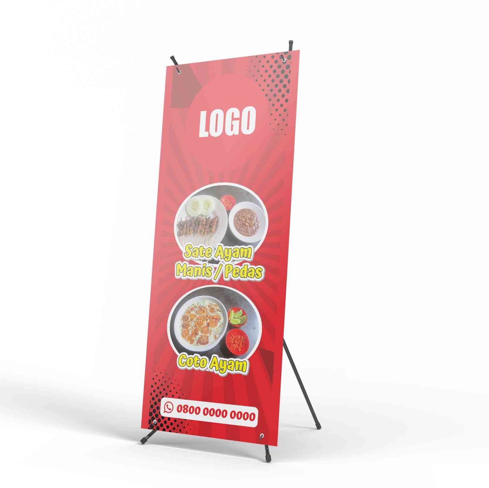 X-banner memiliki desain sebagai berikut:1. Ukuran & BentukJenis: X-banner (berdiri dengan rangka X-frame)Bentuk: Vertikal persegi panjang2. Desai...
