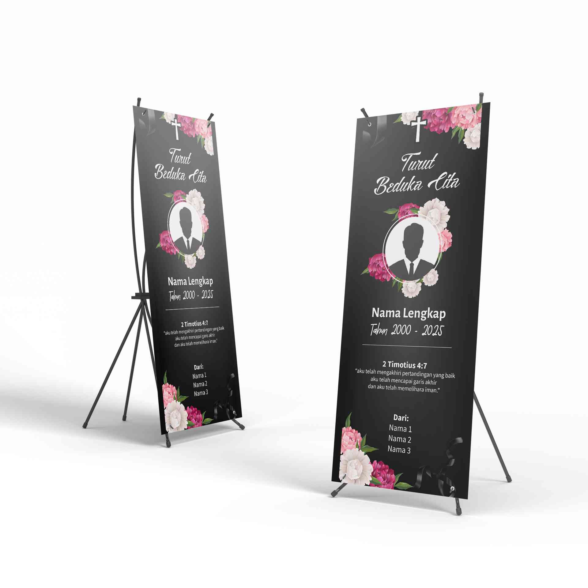 Deskripsi:Banner duka cita ini dirancang dengan nuansa elegan dan penuh rasa hormat. Menggunakan latar belakang hitam yang mendalam, desain ini menamp...