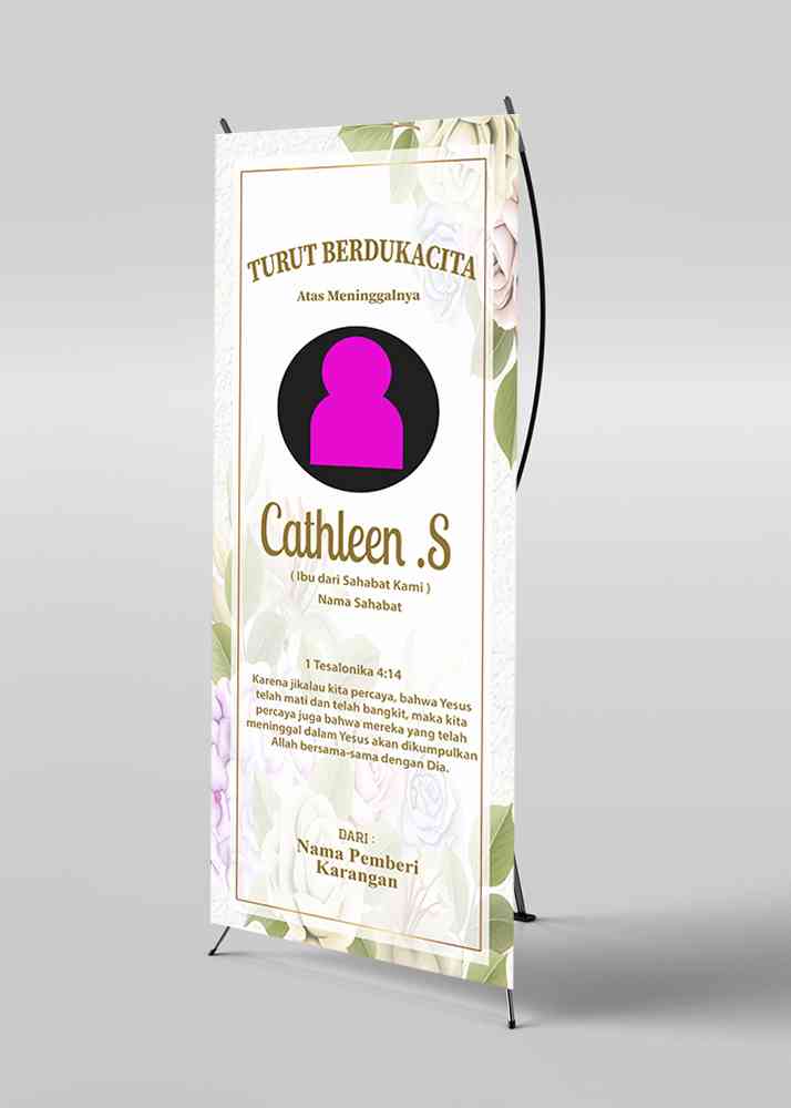 Banner duka cita ini didesain dengan nuansa lembut dan tenang, didominasi oleh warna putih dan biru keabu-abuan yang menggambarkan kesedihan dan ketulusan hati. Di bagian atas terdapat tulisan "Selamat Jalan Kakak Tersayang" sebagai ungkapan perpisahan yang penuh kasih. Potret siluet mendiang ditempatkan di tengah dengan bingkai bulat yang elegan. Tercantum juga nama lengkap, tahun lahir dan wafat, serta kutipan ayat penghiburan dari 2 Timotius 4:7, memberikan sentuhan religius dan harapan. Dekorasi bunga dengan tone monokrom biru-putih menambahkan kesan damai dan menghormati. Di bagian bawah, tercantum nama-nama keluarga atau kerabat yang menyampaikan belasungkawa. Banner ini cocok digunakan dalam acara persemayaman, pemakaman, atau bentuk penghormatan terakhir lainnya.