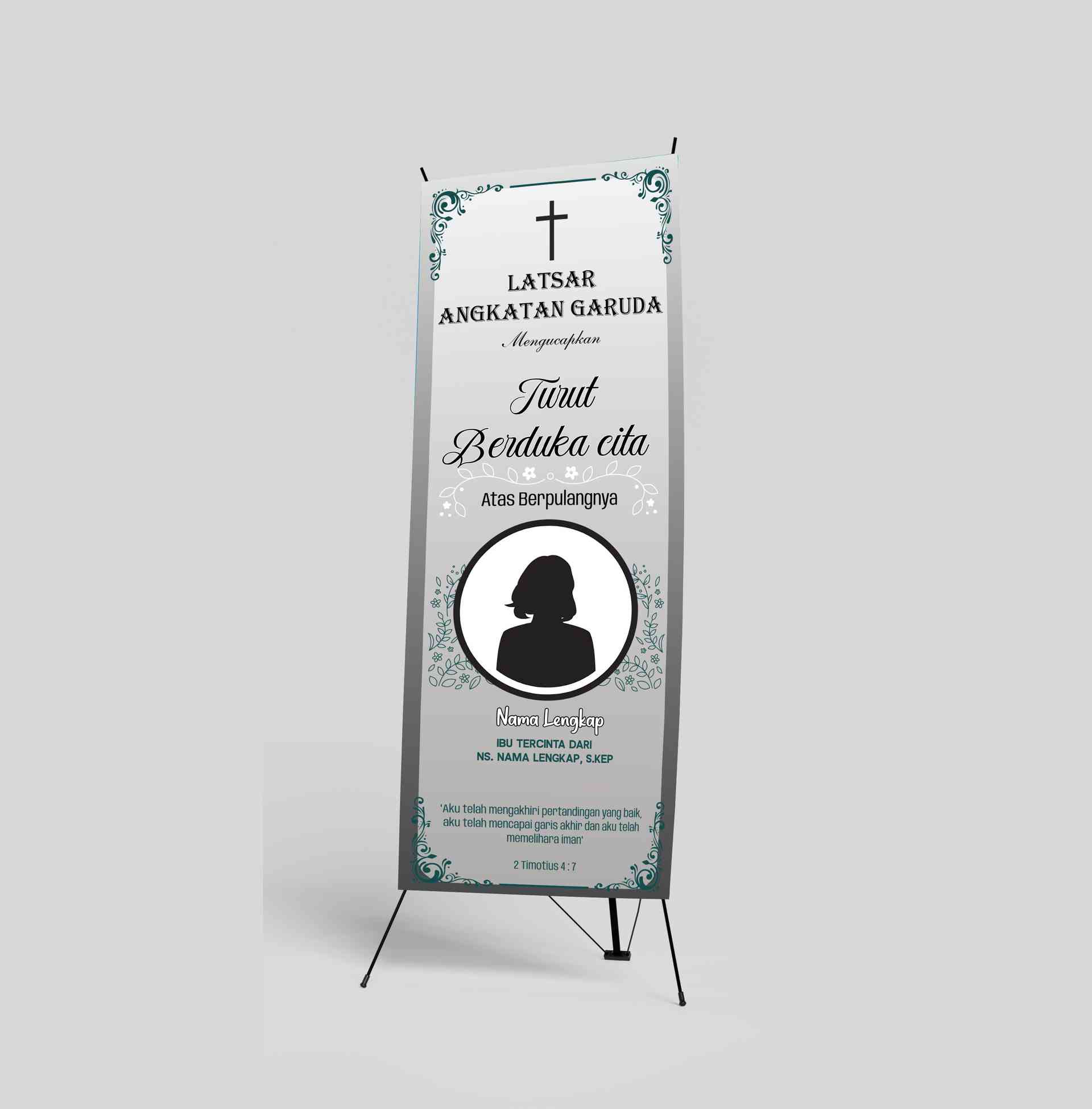banner ucapan belasungkawa. Secara visual, banner ini memiliki bentuk vertikal dengan latar belakang bernuansa abu-abu dengan gradasi gelap ke terang....