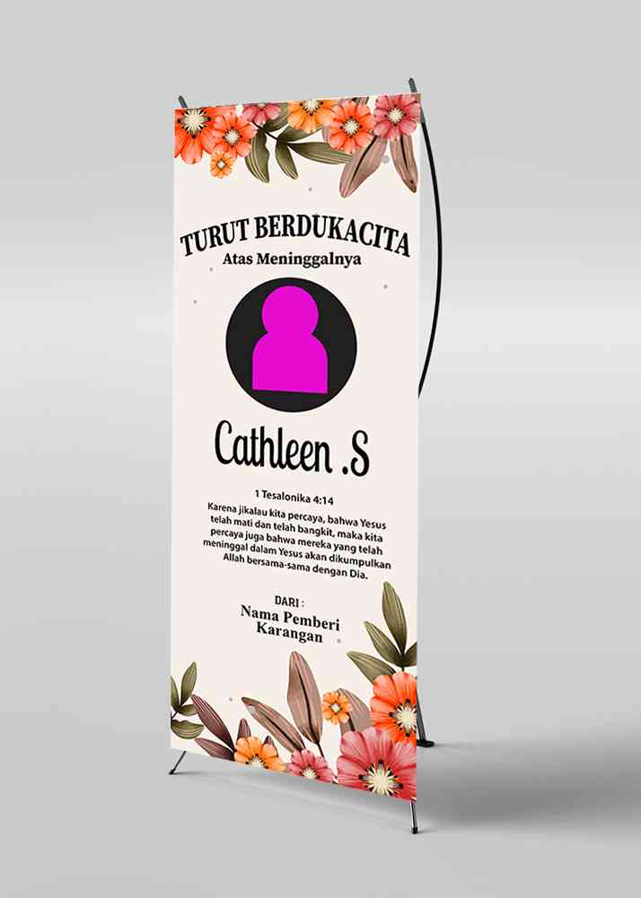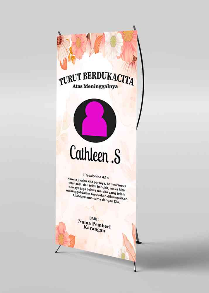 Produk ini adalah sebuah standing banner ucapan belasungkawa yang dirancang untuk menghormati seseorang yang telah meninggal dunia. Banner ini memiliki desain elegan dengan latar belakang bernuansa lembut, tulisan "REST IN PEACE" di bagian atas, serta ruang untuk menampilkan foto almarhum/almarhumah. Di bagian tengah, terdapat nama lengkap yang ditulis dengan font artistik, diikuti dengan kutipan ayat yang memberikan pesan tentang kehidupan yang telah dijalani dengan baik. Pada bagian bawah, terdapat informasi pengirim belasungkawa, dalam hal ini dari pemberi. Banner ini cocok digunakan dalam acara persemayaman, pemakaman, atau sebagai bentuk penghormatan terakhir kepada orang yang telah berpulang.