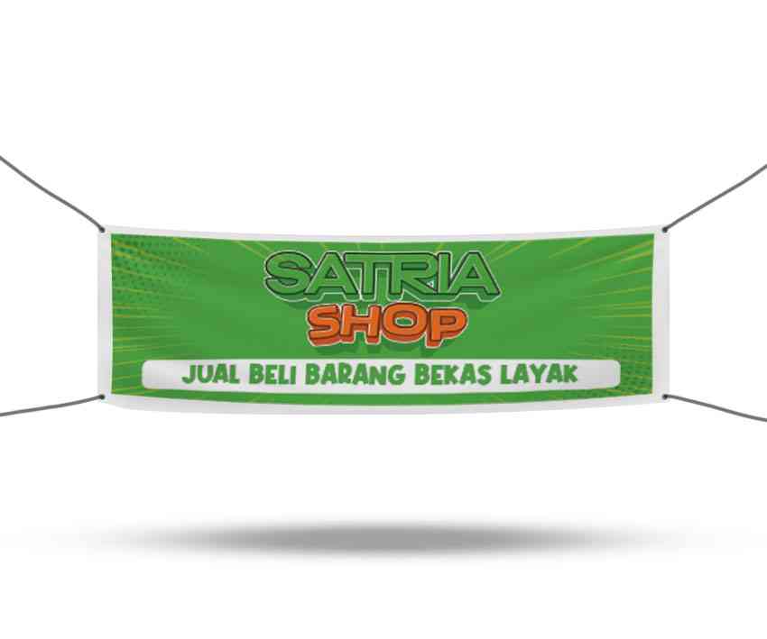 Dengan warna hijau segar dan kombinasi teks oranye, banner ini mengusung konsep jual beli barang bekas layak pakai. Nama Satria Shop ditampilkan menco...