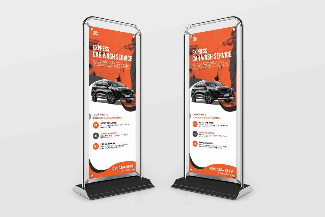 Banner roll-up untuk layanan cuci mobil ekspres yang menawarkan berbagai paket layanan cuci mobil dengan harga terjangkau. Paket yang tersedia mencaku...