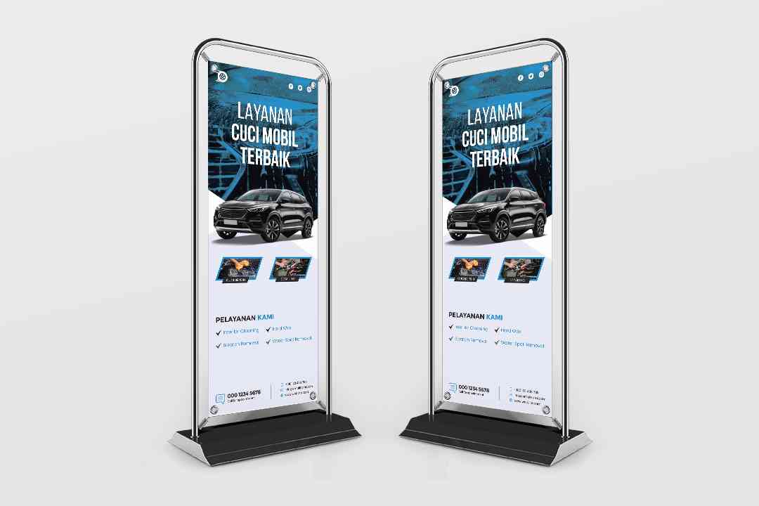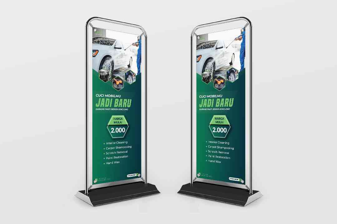 Banner roll-up untuk layanan cuci mobil ekspres yang menawarkan berbagai paket layanan cuci mobil dengan harga terjangkau. Paket yang tersedia mencaku...