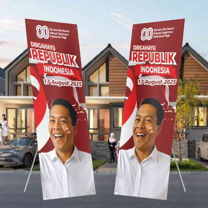 X Banner bertemakan modern merah putih untuk memperingati Hari Kemerdekaan Indonesia ini berbentuk vertikal dengan dominasi warna merah dan putih, men...