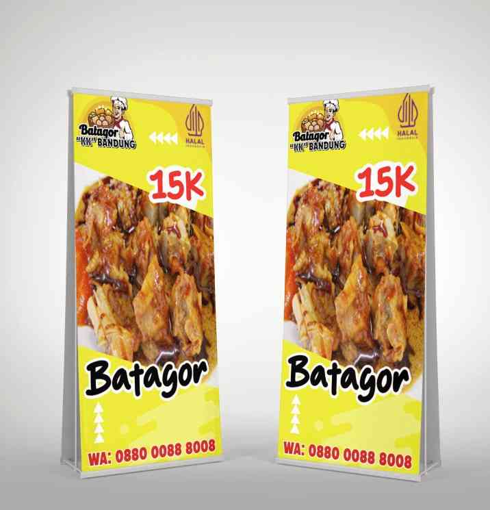 Logo “Batagor ‘KK’ Bandung” terletak di sisi kiri atas.Di kanan atas terdapat logo “Halal MUI” berwarna ungu.Warna latar kuning terang dengan potongan...