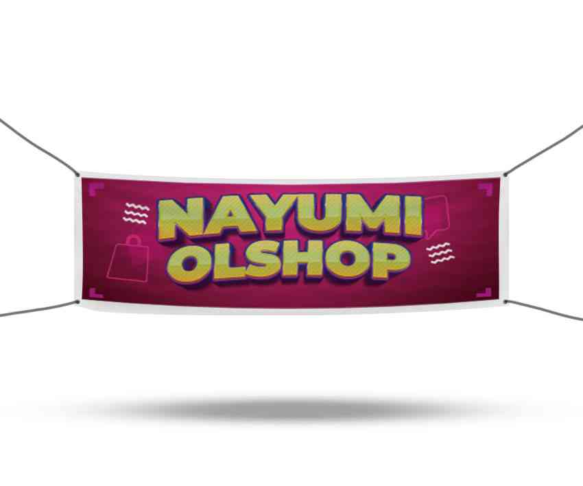 Dengan latar ungu dan aksen grafis seperti ikon keranjang belanja, banner ini dirancang untuk olshop yang modern. Font besar berwarna kuning kehijauan...