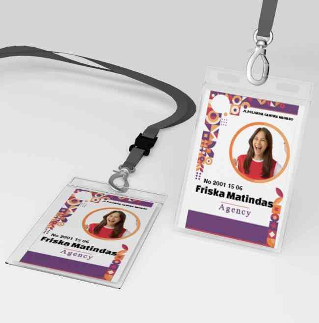 ID Card bertema ceria untuk sekolah ini memiliki bentuk persegi panjang dengan sudut melengkung, menampilkan foto karakter perempuan muda dalam bingka...