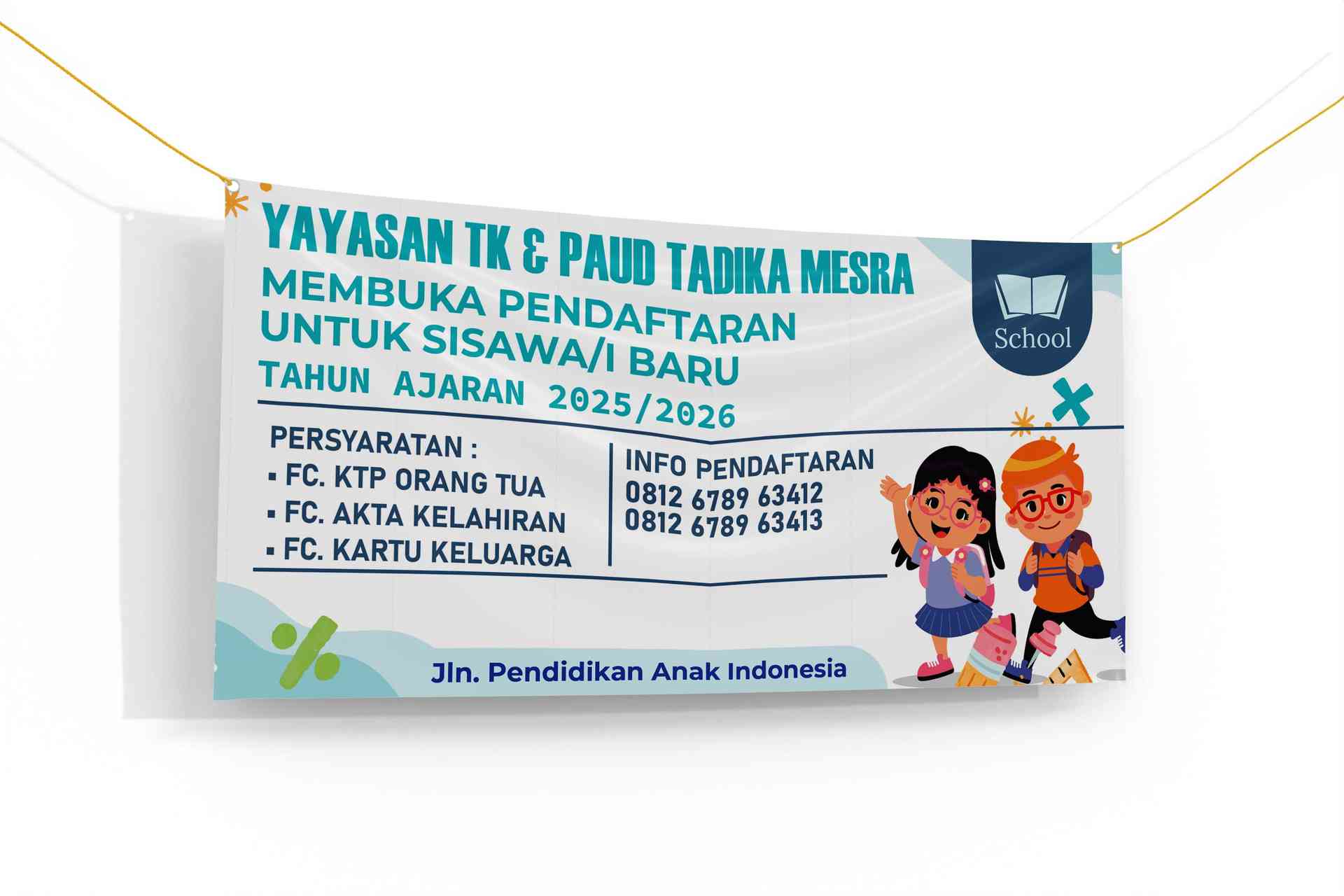 Banner ini dirancang untuk memberikan informasi tentang pendaftaran siswa baru di Yayasan TK & PAUD Tadika Mesra untuk tahun ajaran 2025/2026. Menggunakan desain ceria dengan ilustrasi anak-anak yang menarik dan ramah, banner ini memuat informasi lengkap mengenai persyaratan pendaftaran, termasuk fotokopi KTP orang tua, akta kelahiran, dan kartu keluarga. Dengan warna dominan hijau dan biru yang segar, banner ini cocok untuk menarik perhatian orang tua yang ingin mendaftarkan anak mereka ke sekolah. Informasi kontak pendaftaran juga disertakan untuk memudahkan komunikasi lebih lanjut.