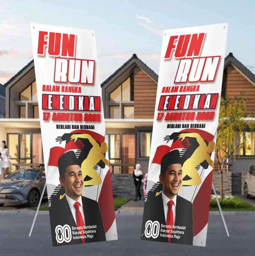 Banner cetak dengan tampilan vertikal ini berwarna dominan merah dan putih, menonjolkan ilustrasi dua pelari dalam gaya dinamis sebagai karakter utama, serta elemen teks besar bertuliskan “2025 Semangat Perjuangan Fun Run dalam Kemerdekaan”. Desain mengangkat tema kemeriahan acara lari sehat dengan nuansa perjuangan dan kemerdekaan, menyasar penyelenggara kegiatan Fun Run, komunitas olahraga, serta peserta atau sponsor event bertema nasional, sering digunakan sebagai media promosi di ruang publik atau area start/finish lomba.