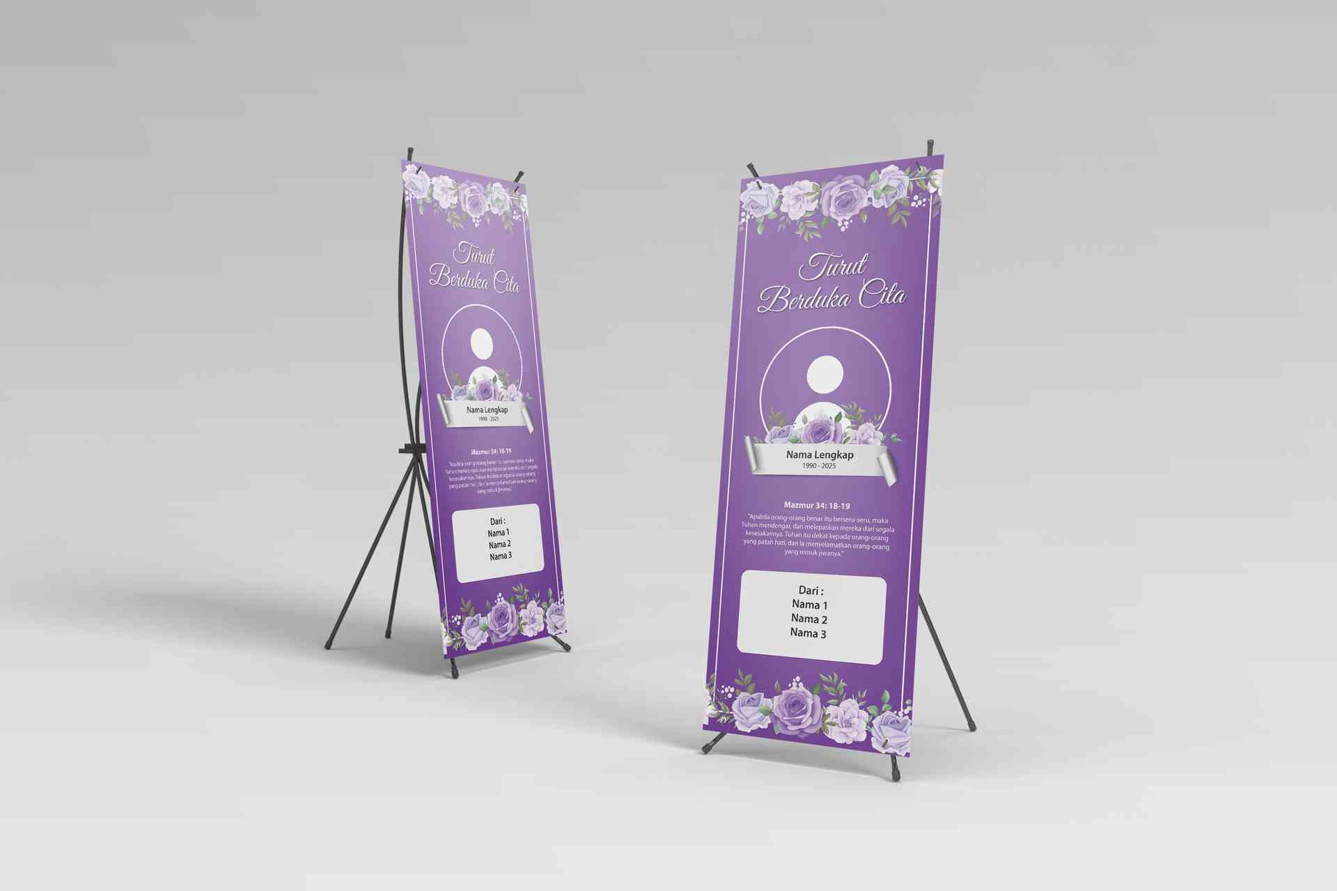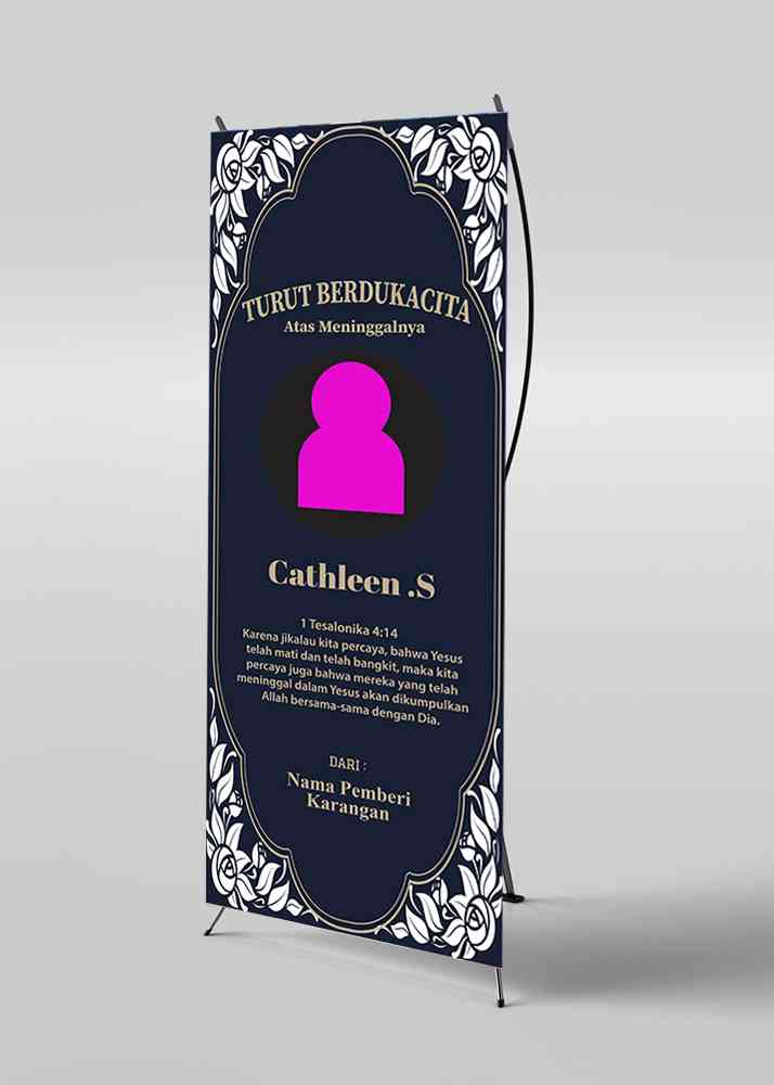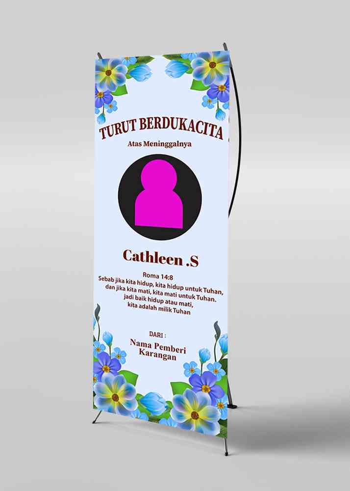Banner duka dengan tema ungu ini dirancang dengan kesan yang elegan, penuh penghormatan, dan penuh ketenangan. Warna ungu dipilih karena melambangkan kedalaman perasaan, kebijaksanaan, dan keabadian, yang menciptakan suasana yang damai dan penuh makna dalam mengenang seseorang yang telah pergi. Di sekitar tulisan, dihiasi dengan bunga-bunga ungu, seperti anggrek atau lavender, yang melambangkan kenangan yang abadi dan keindahan yang tetap hidup meskipun seseorang telah tiada. Latar belakang banner menggunakan gradasi warna ungu yang lembut, dari ungu muda ke ungu tua, memberikan kesan tenang dan penuh kedalaman. Di bagian bawah, terdapat garis-garis tipis berwarna putih yang memberikan sentuhan keanggunan dan kesan sakral. Desain banner ini mengedepankan kesederhanaan namun penuh makna, menciptakan suasana yang penuh penghormatan dan rasa syukur atas kehidupan yang telah dijalani oleh almarhum. Banner ini cocok untuk dipasang di rumah duka, tempat ibadah, atau area publik yang digunakan untuk mengenang dan memberi penghormatan terakhir.