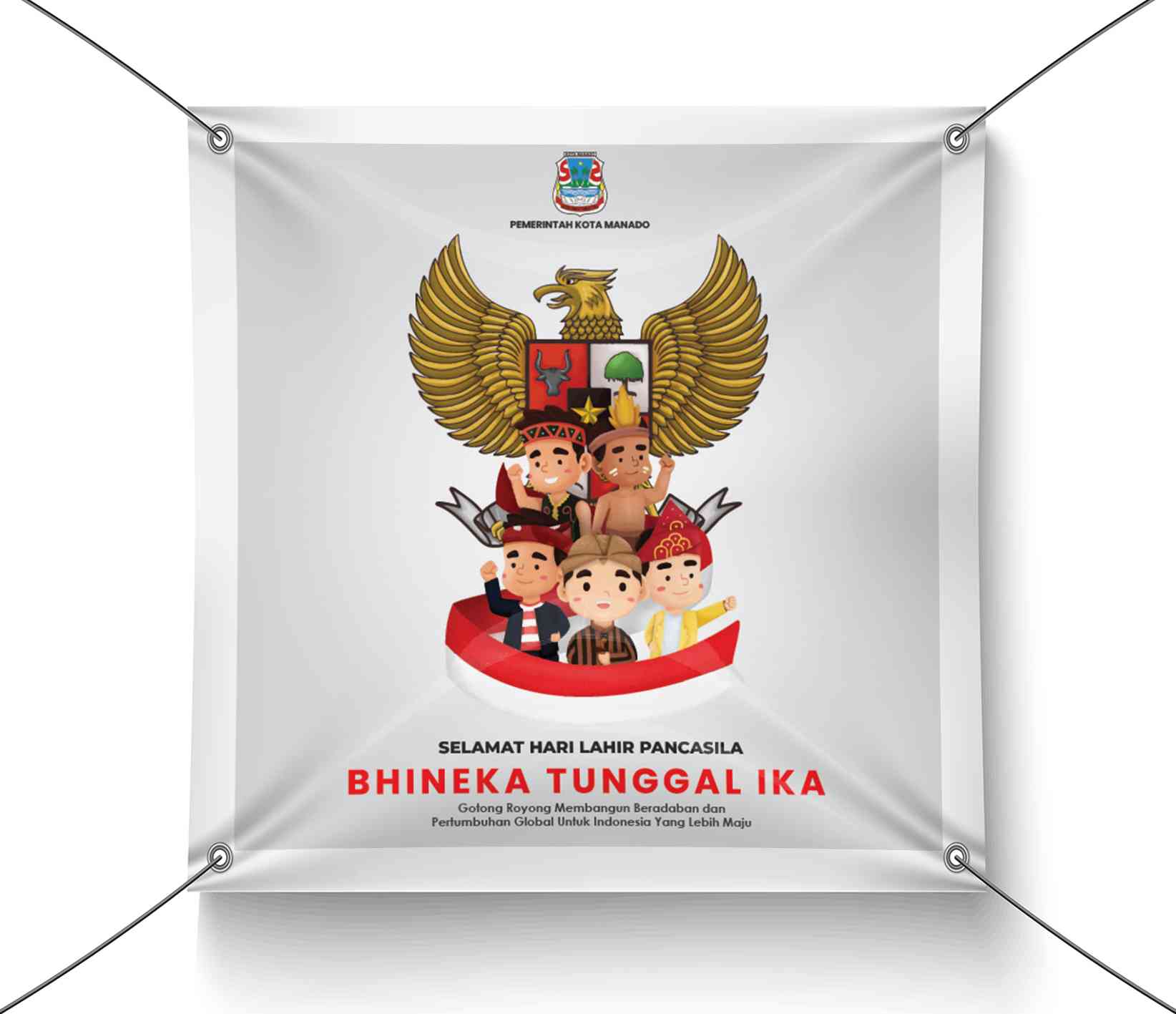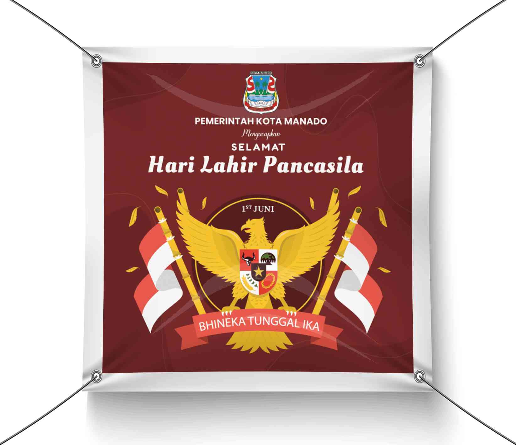 Banner ini memperingati Hari Lahir Pancasila dengan tema Bhinneka Tunggal Ika, yang menekankan keberagaman dan persatuan bangsa Indonesia. Desain bann...