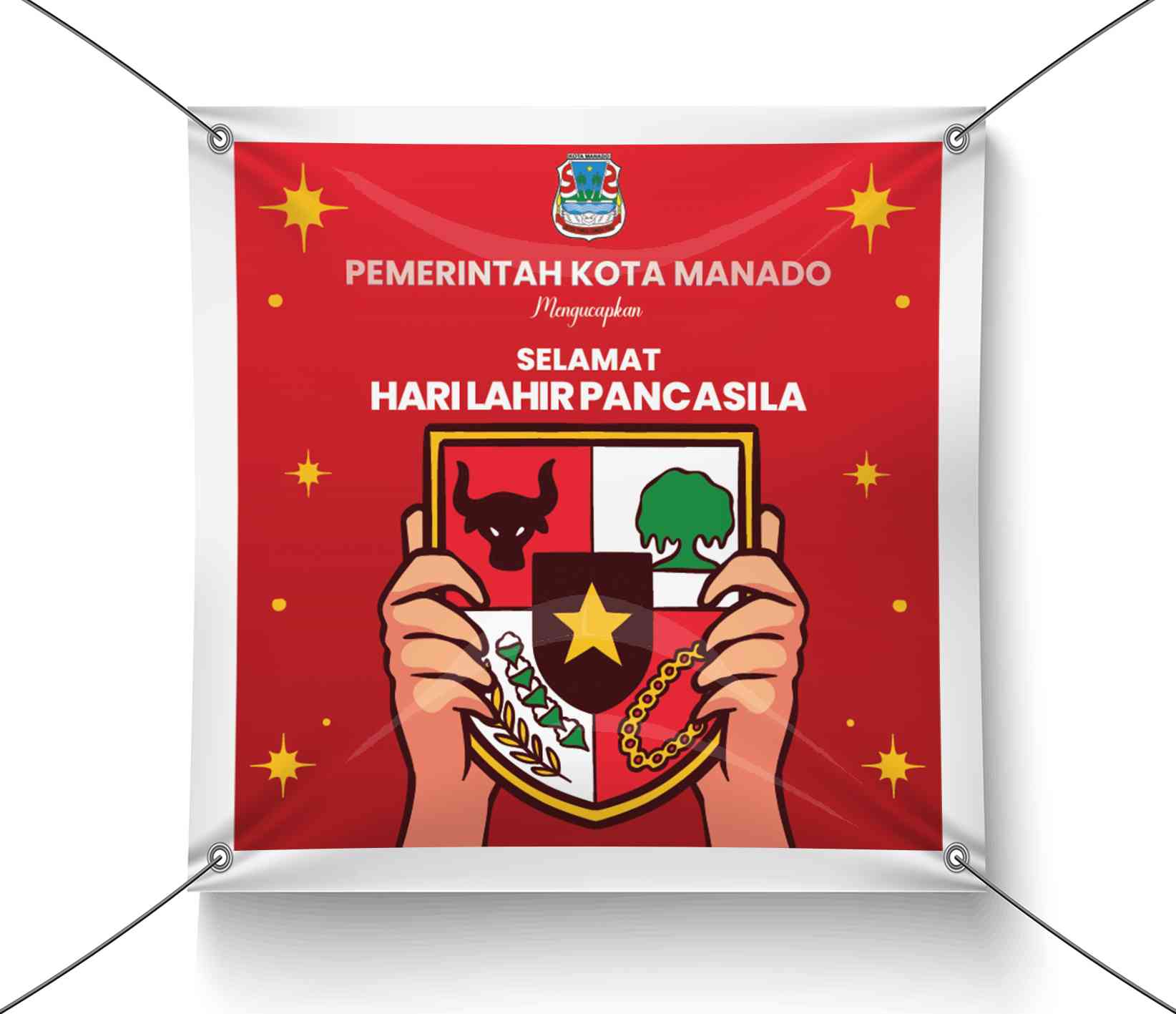 Banner ini menunjukkan simbol Pancasila yang digambarkan dengan tangan yang memegang lambang negara. Desain ini mengedepankan simbol kekuatan dan pers...