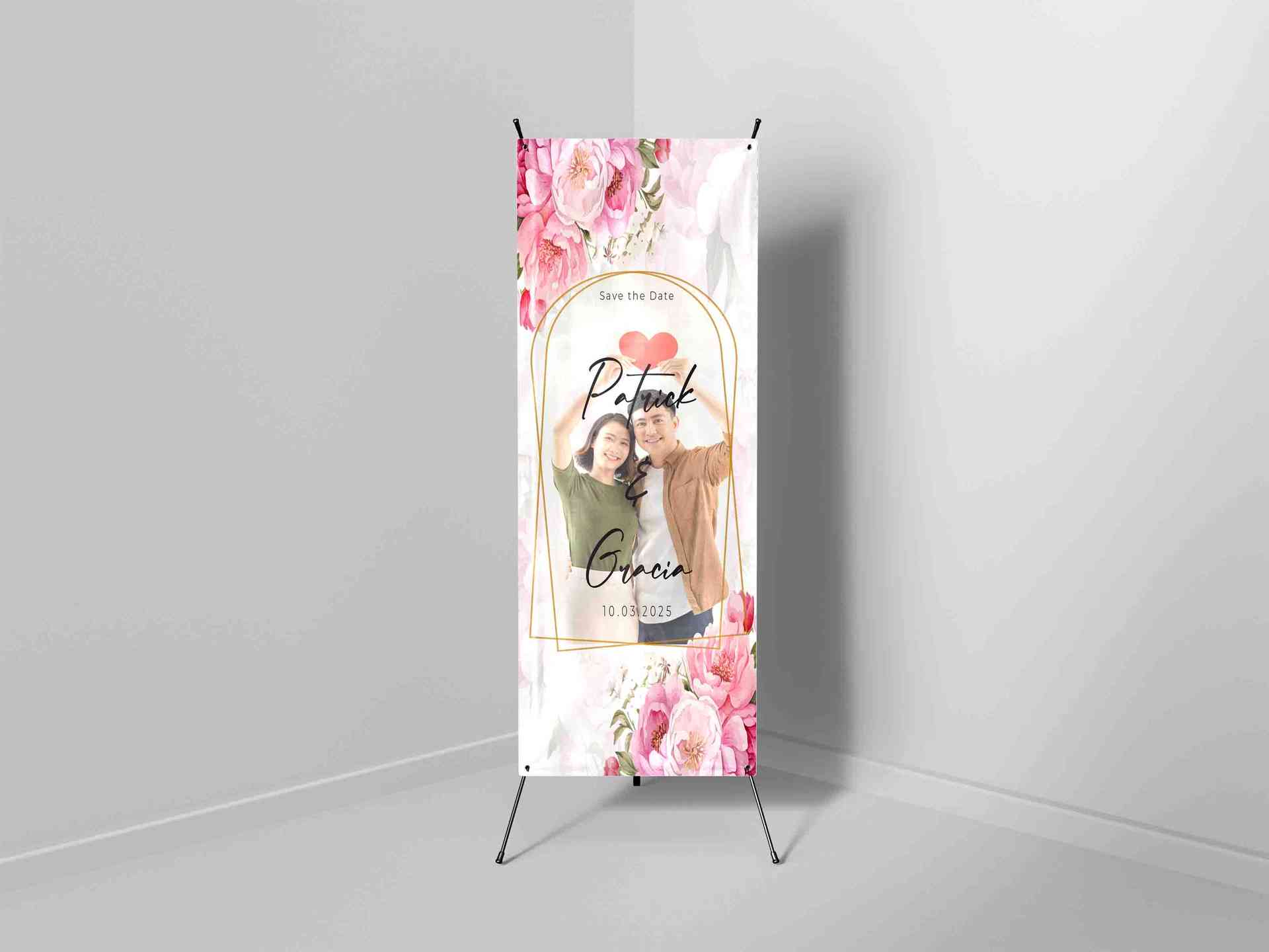 X Banner pernikahan dengan tema floral ini memiliki bentuk vertikal memanjang dan menonjolkan karakter desain romantis berkat penggunaan ilustrasi bun...