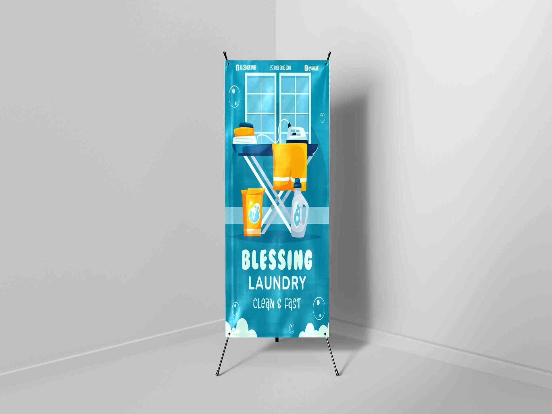 X Banner Blessing Laundry Cuci Setrika merupakan media promosi berbentuk banner vertikal dengan tema layanan laundry. Visual utama menampilkan ilustra...