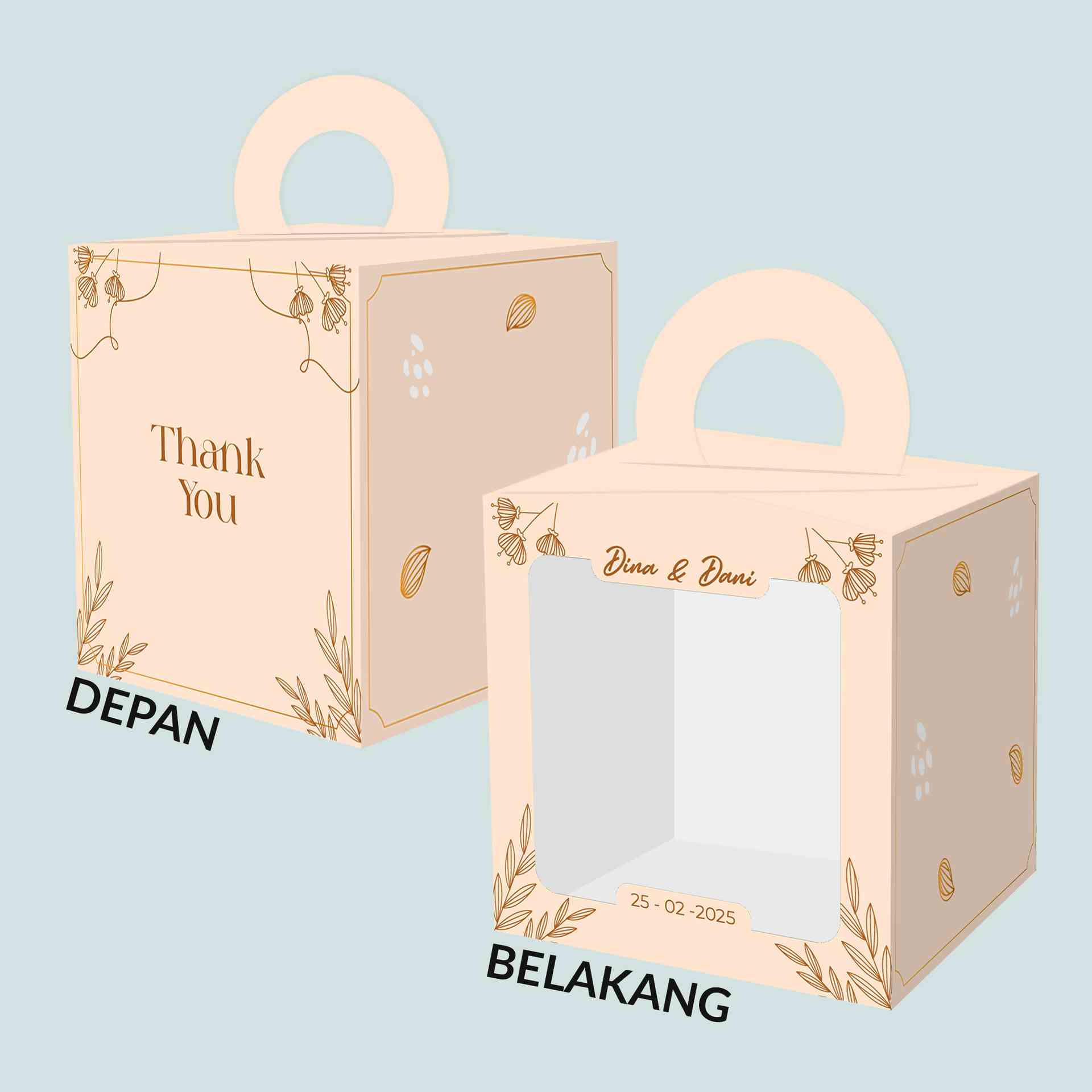 Desain kotak ini memiliki tampilan yang simpel, elegan, dan klasik, cocok untuk suvenir pernikahan dengan tema yang anggun dan berkesan.