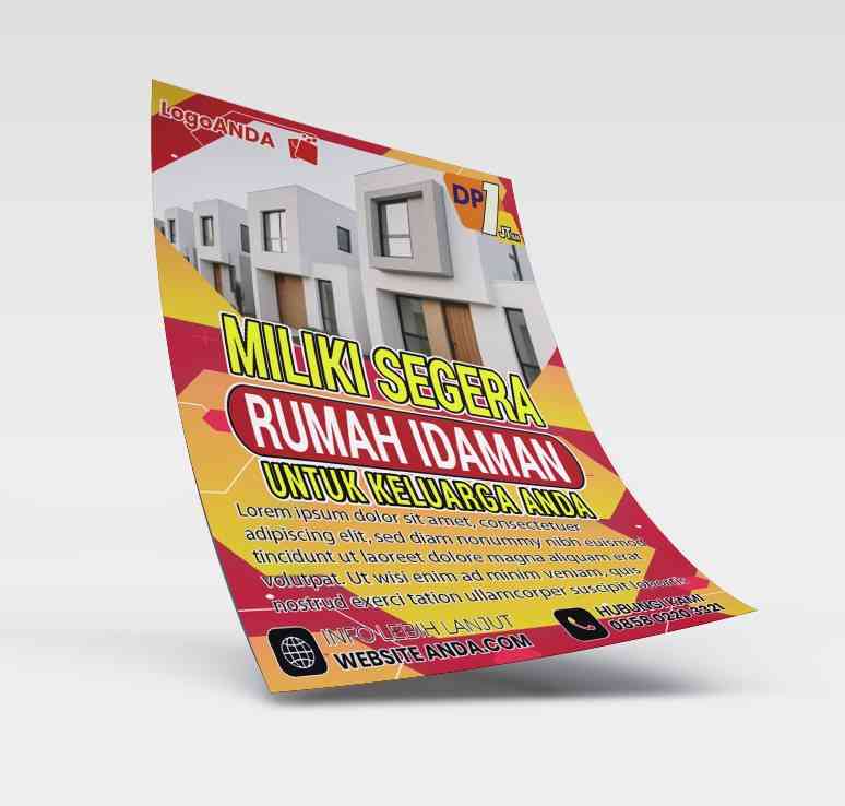 flyer brosur promosi properti bergaya modern dan minimalis sebagai media promosi, menampilkan slogan “Miliki Segera Rumah Idaman untuk Keluarga Anda”. Desain ini menggunakan kombinasi warna yang mencolok untuk menarik perhatian publik secara maksimal. Terdapat visual rumah dua lantai berarsitektur kontemporer yang menonjolkan kesan elegan dan kekinian dengan.