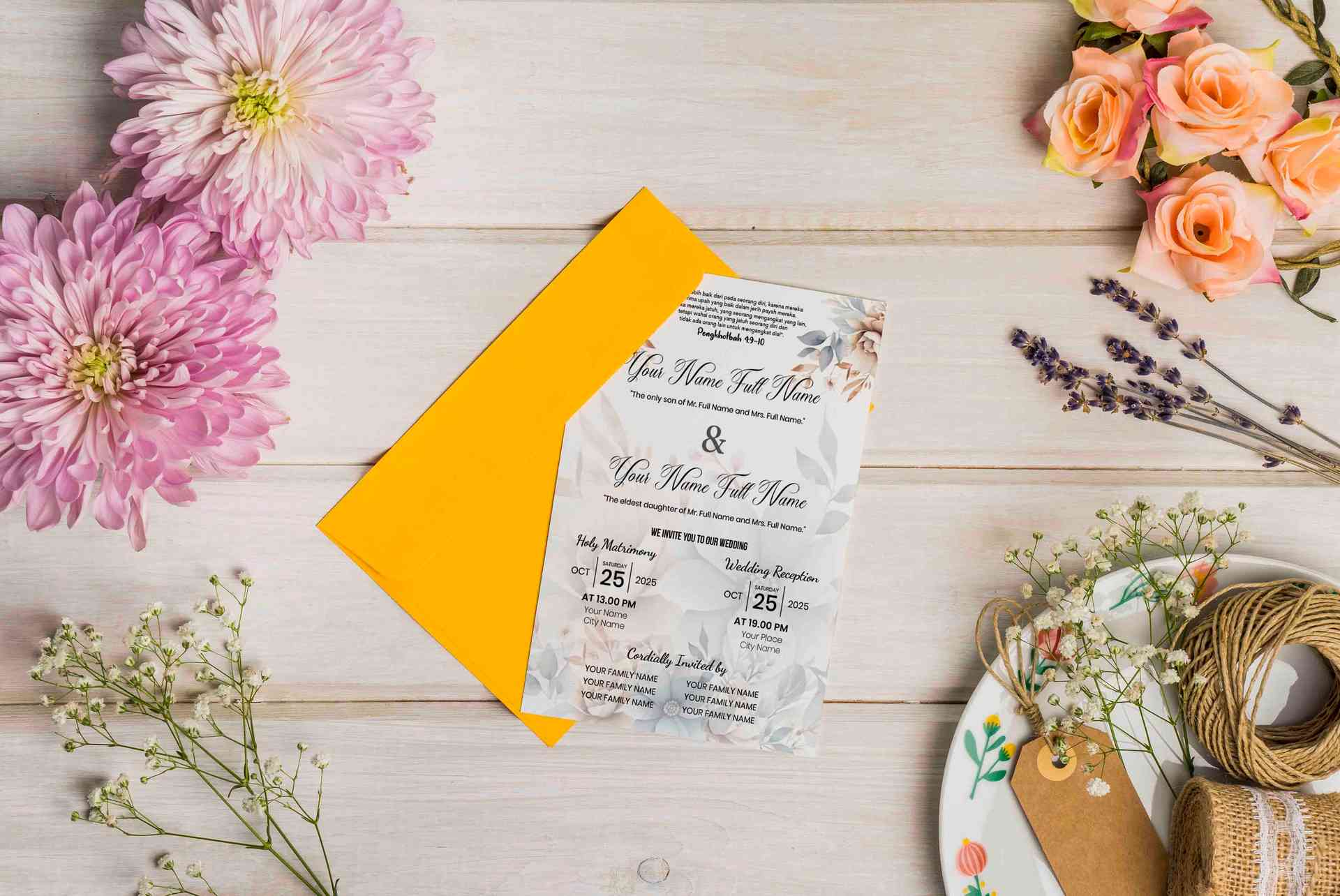 Undangan pernikahan ini menampilkan nuansa floral pastel yang lembut dan elegan, memancarkan suasana cinta yang hangat dan sakral. Desainnya menonjolk...