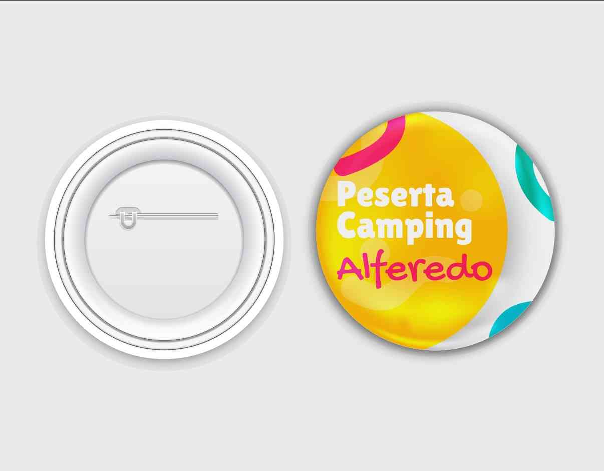 Pin peniti ini menghadirkan desain ceria dan enerjik dengan latar belakang kuning yang cerah, menggambarkan semangat petualangan camping. Teks "Pesert...