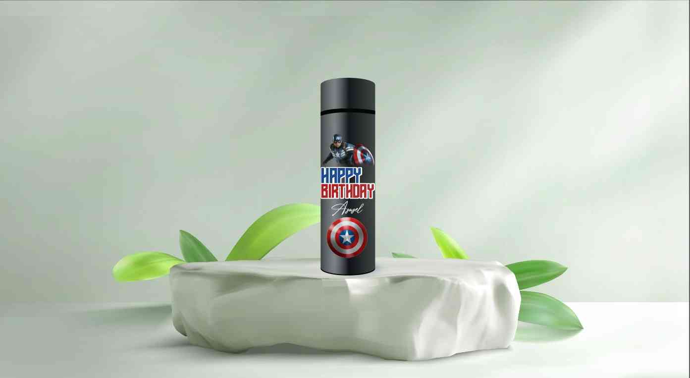 Desain ini menampilkan konsep personalisasi pada botol termos berwarna biru tua dengan tampilan yang modern dan minimalis.Nama PersonalTeks "REZA" dil...