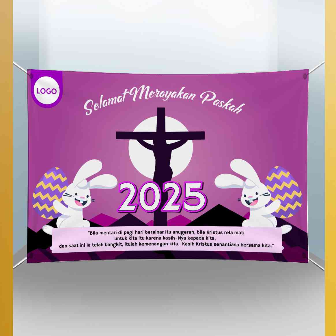 Deskripsi Desain Spanduk Paskah 2025:Desain spanduk ini dirancang dengan nuansa ceria dan penuh makna untuk merayakan Paskah tahun 2025. Latar belakan...