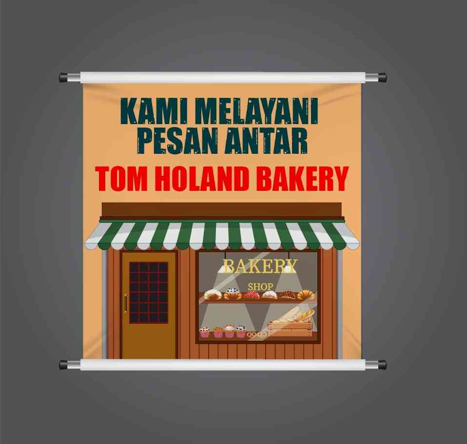 Baliho ini dirancang untuk memperkenalkan layanan pesan antar dari Tom Holland Bakery. Judul utama "KAMI MELAYANI PESAN ANTAR" menggunakan font tebal...