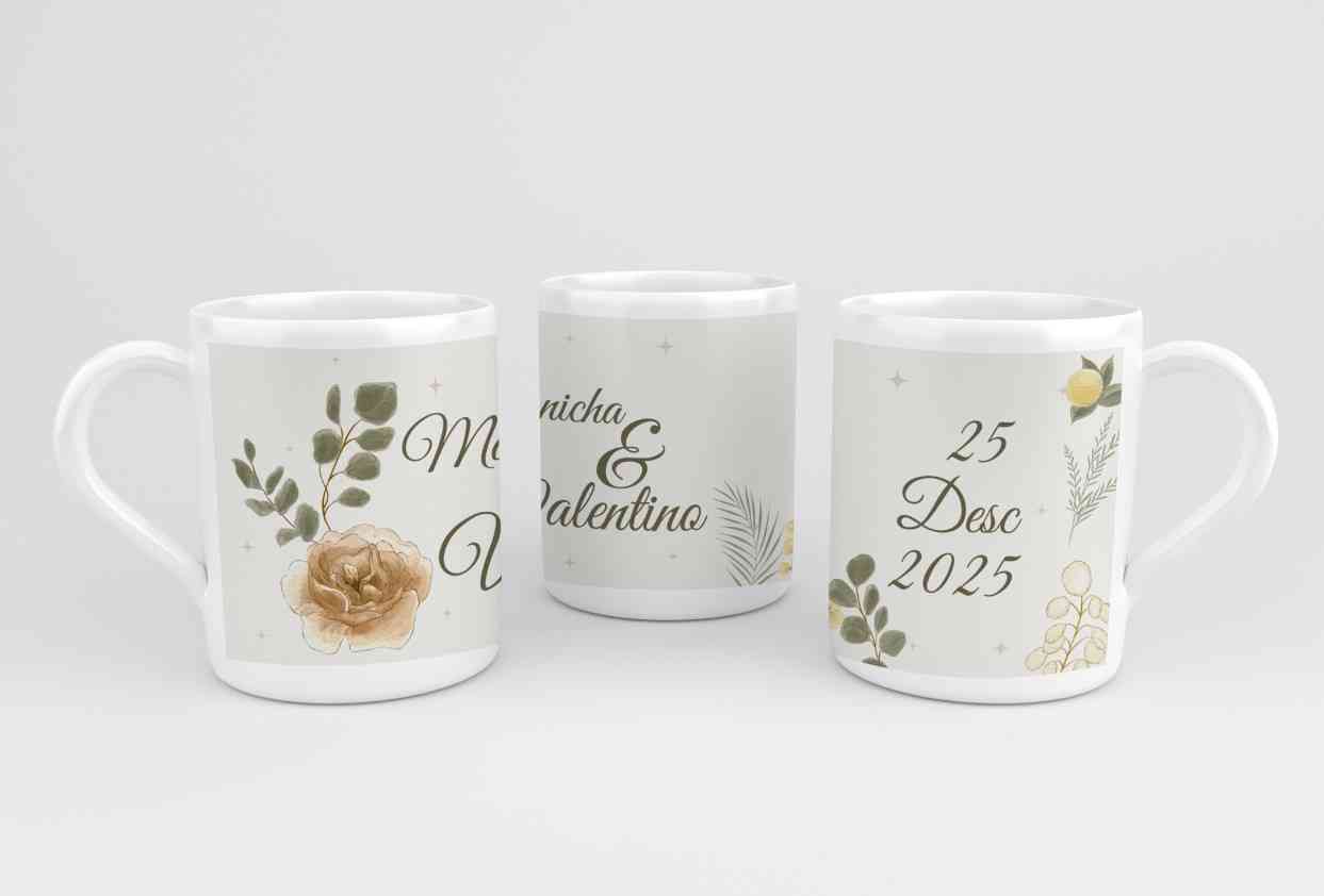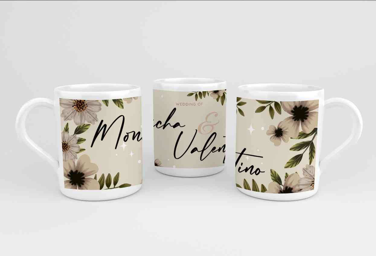 Desain mug bertema pernikahan ini memiliki nuansa elegan dan mewah dengan dominasi warna krem dan hijau olive. Dihiasi ilustrasi bunga-bunga klasik ya...