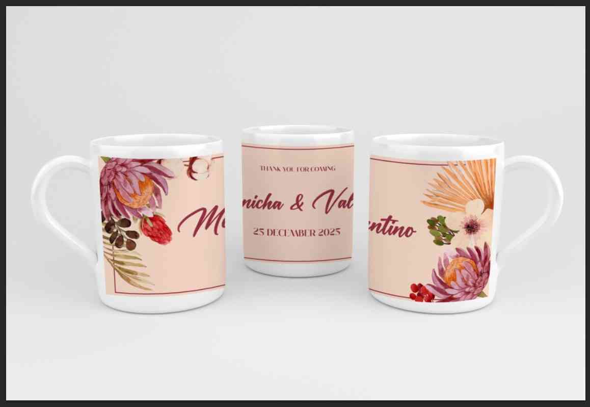 Desain mug ini menampilkan gaya artistik watercolor dengan nuansa natural yang hangat dan romantis. Kombinasi bunga mawar merah marun, dedaunan tropis hijau, dan latar krem bernoda percikan cat air menciptakan kesan handmade yang elegan. Tulisan "Wedding Of Monicha & Valentino" ditulis dengan kombinasi font script dan bold, memberikan kesan personal dan menonjol. Di bawahnya terdapat tanggal “25 Desember 2025” dalam gaya tulisan tangan yang lembut. Komposisi visual ini sangat cocok diaplikasikan sebagai desain mug souvenir pernikahan bertema rustic, tropical, atau natural dengan sentuhan artistik yang menenangkan dan estetik.