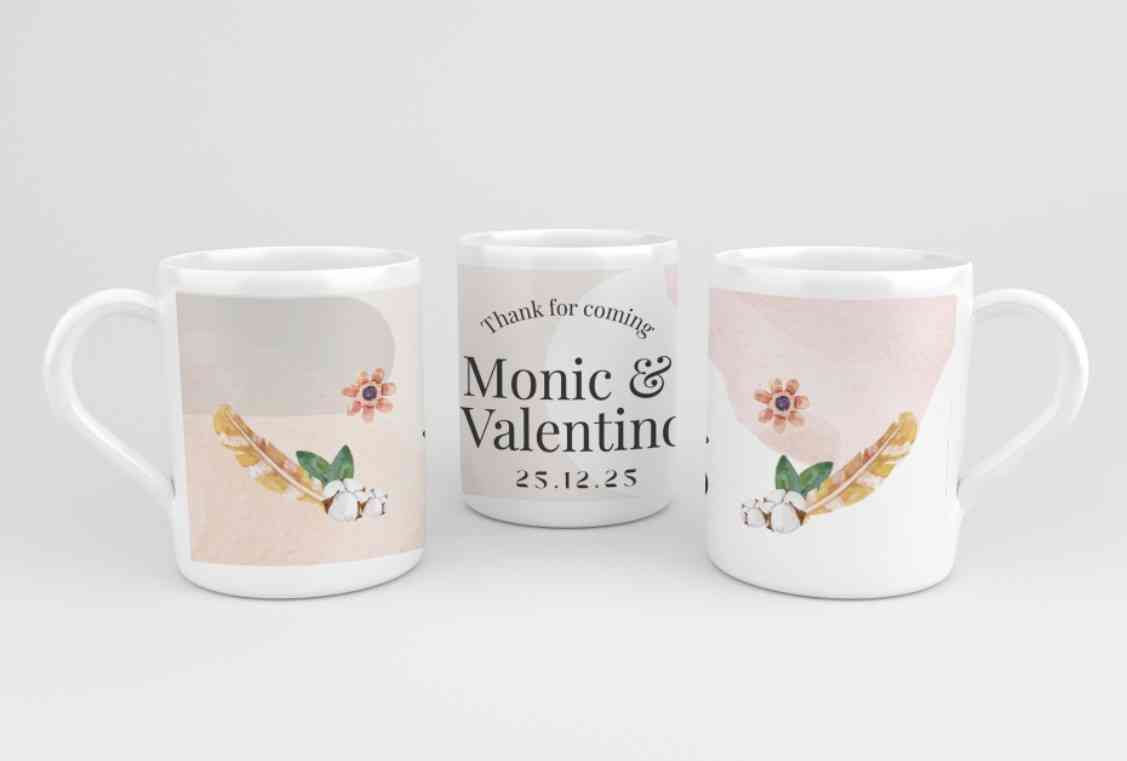 Desain mug bertema pernikahan dengan gaya minimalis artistik. Warna dasar krem lembut dikombinasikan dengan elemen watercolor seperti bulu, bunga keci...