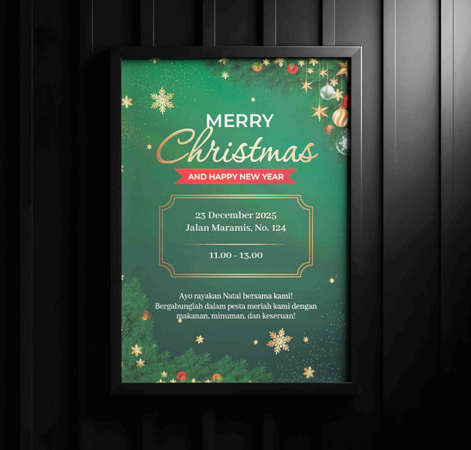 Slim Led Poster Event Natal Warna Hijau merupakan poster LED tipis berbentuk persegi panjang vertikal dengan dominasi warna hijau, menampilkan desain...
