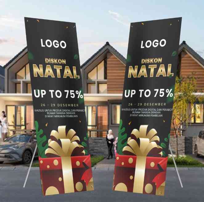 Banner ini adalah standing banner vertikal yang dirancang untuk promosi "Diskon Natal". Desain utamanya memiliki latar belakang berwarna hitam pekat y...