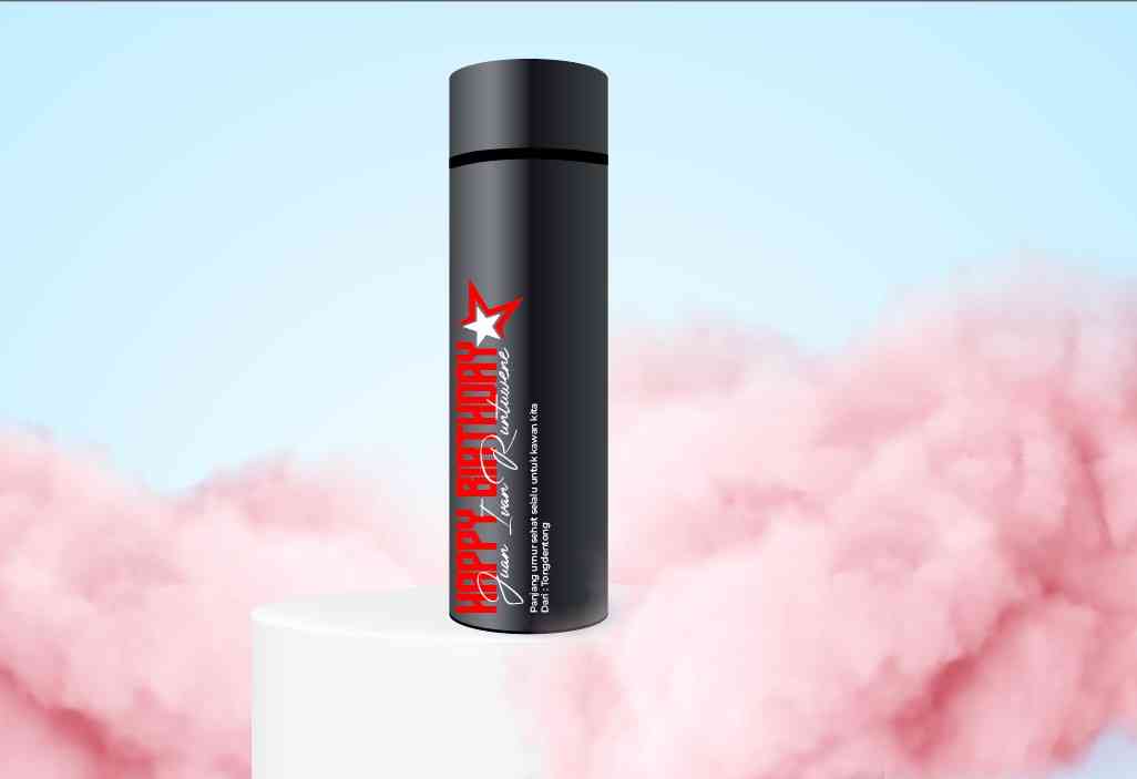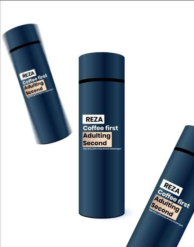 Desain ini menampilkan konsep personalisasi pada botol termos berwarna biru tua dengan tampilan yang modern dan minimalis.Nama PersonalTeks "REZA" dil...
