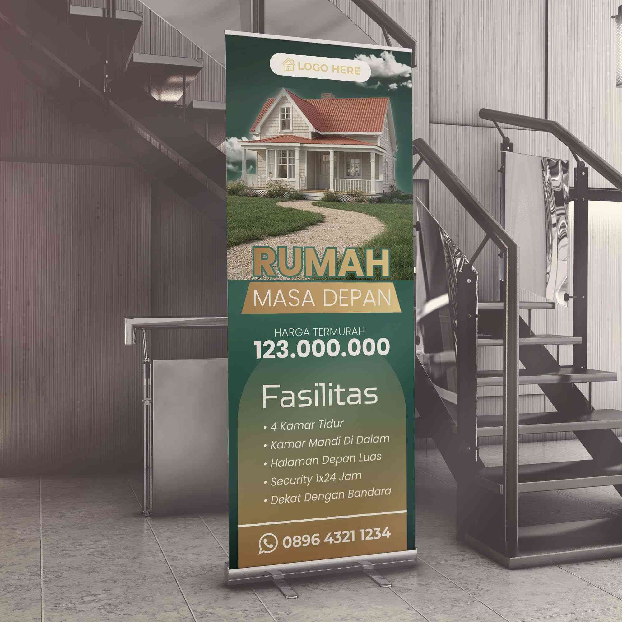 Banner ini menampilkan penawaran rumah masa depan dengan harga terjangkau sebesar 123 juta. Desain banner mencantumkan gambar rumah impian dengan suas...