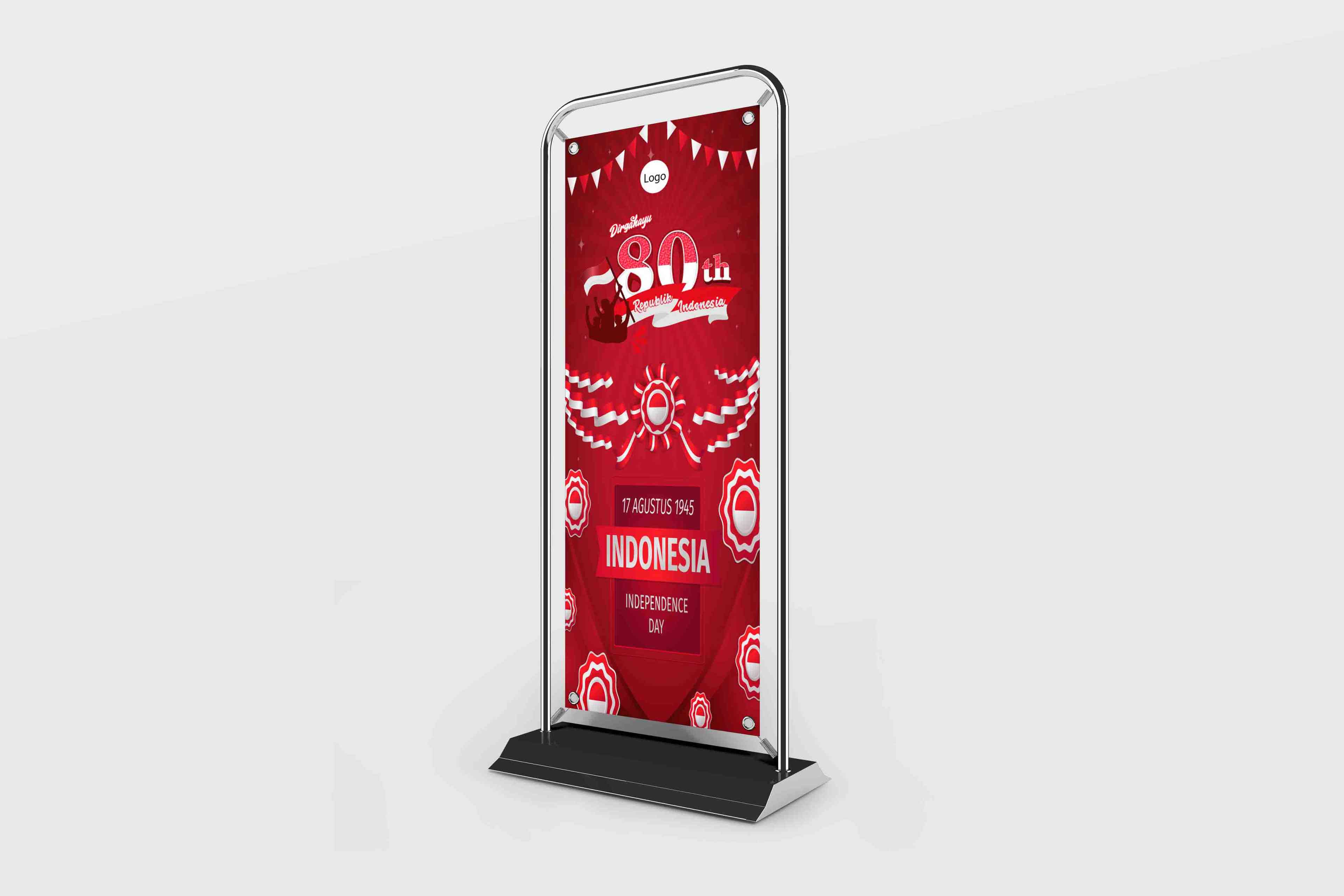 X Banner dengan tema Dirgahayu Indonesia ke-80 ini berbentuk persegi panjang vertikal dengan warna dominan merah dan putih, menonjolkan semangat kemer...
